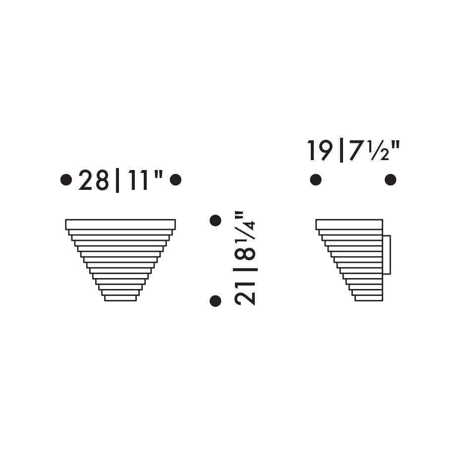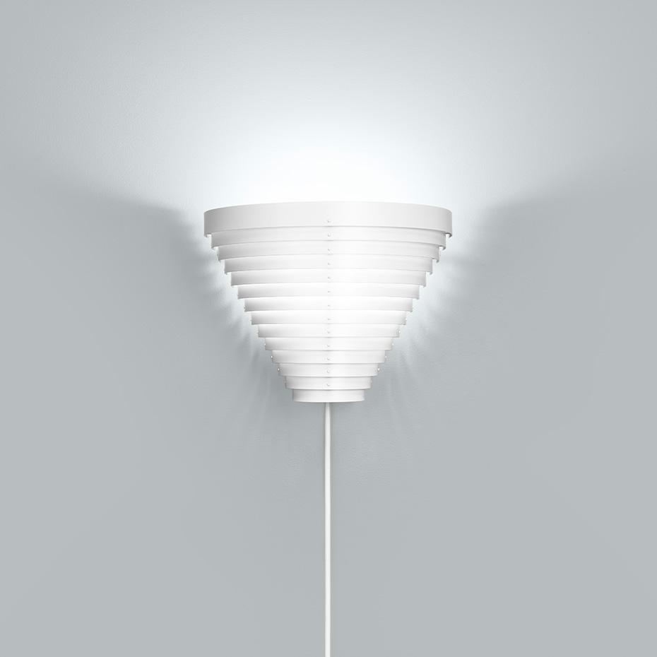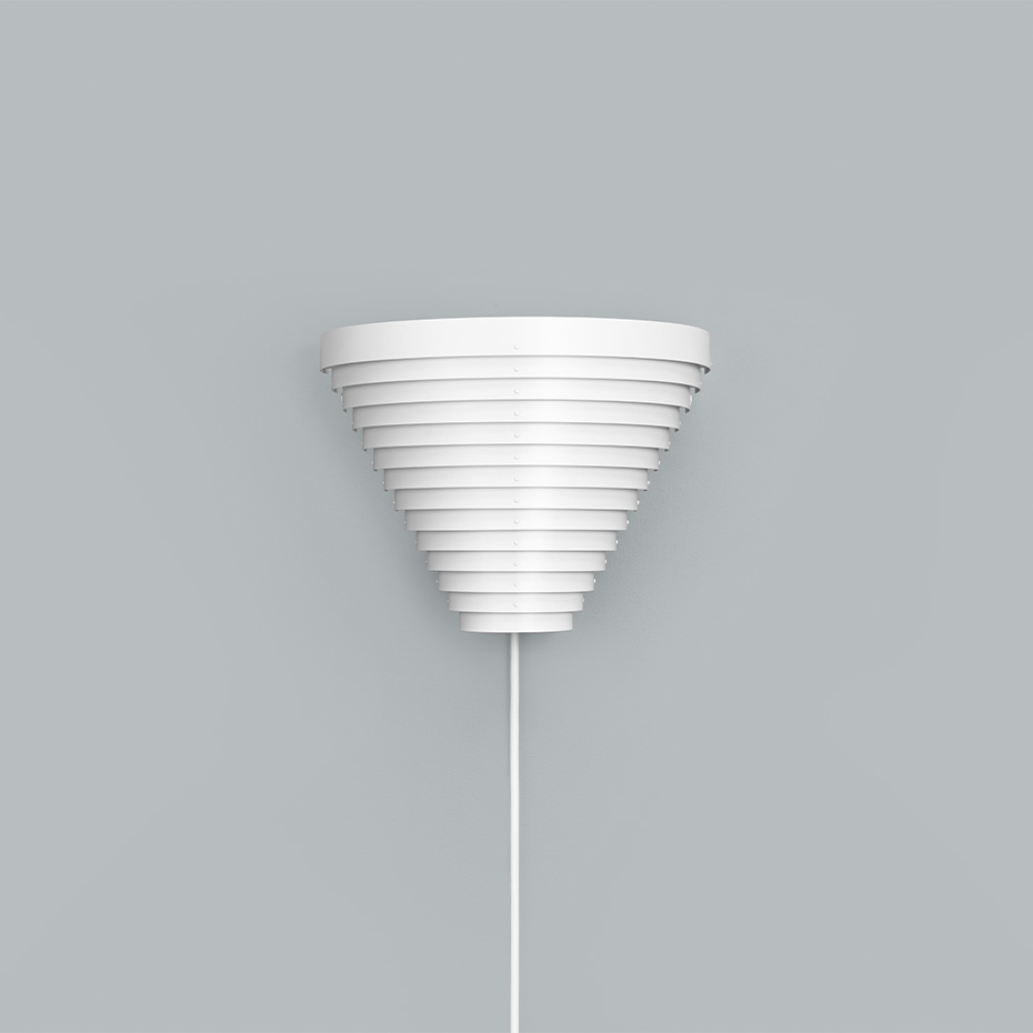 A910 vägglampa från Artek är formgiven av Alvar Aalto under 1950-talet. Den tidlösa designen med en skärm uppbyggd av tunna metallskivor sprider ett mjukt men effektivt ljus och skapar en varm atmosfär i rummet. A910 är framtagen för väggmontering och passar lika bra i offentliga miljöer som i privata hem.