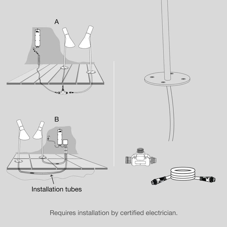 En adapter kan driva max. 6 st AJ Garden pollare (6,5 W). Maximalt avstånd till sista stolpen är 30 m.