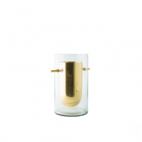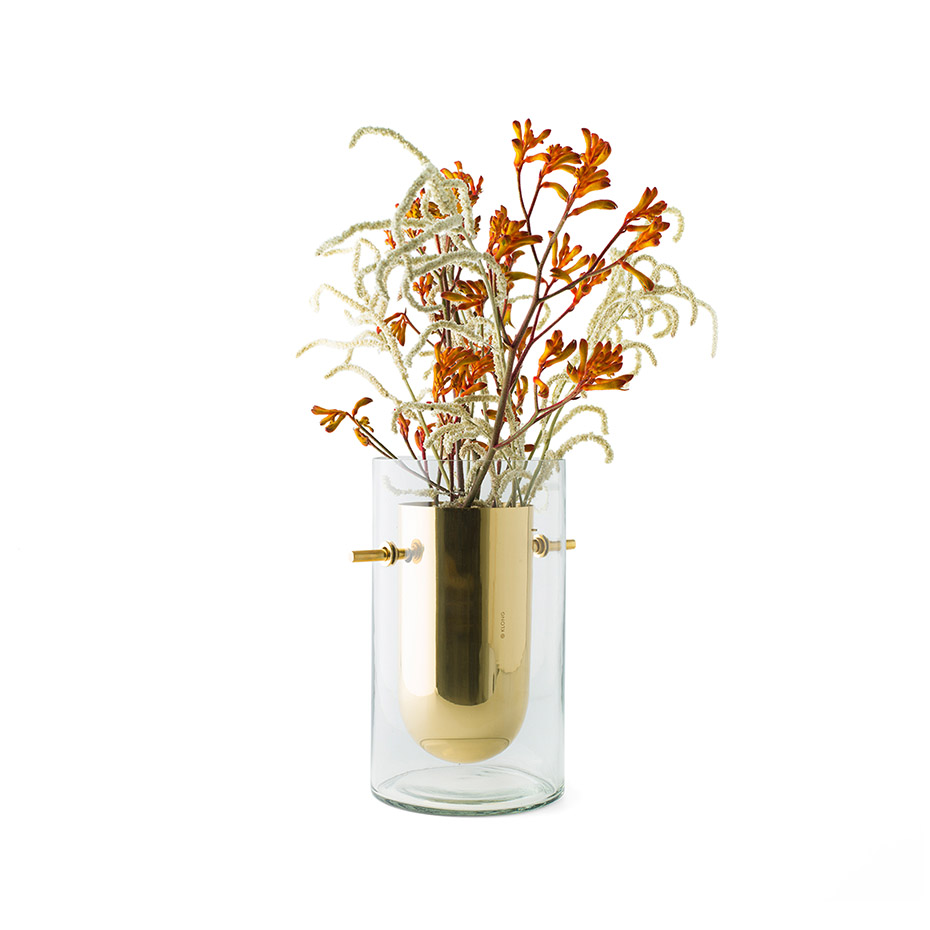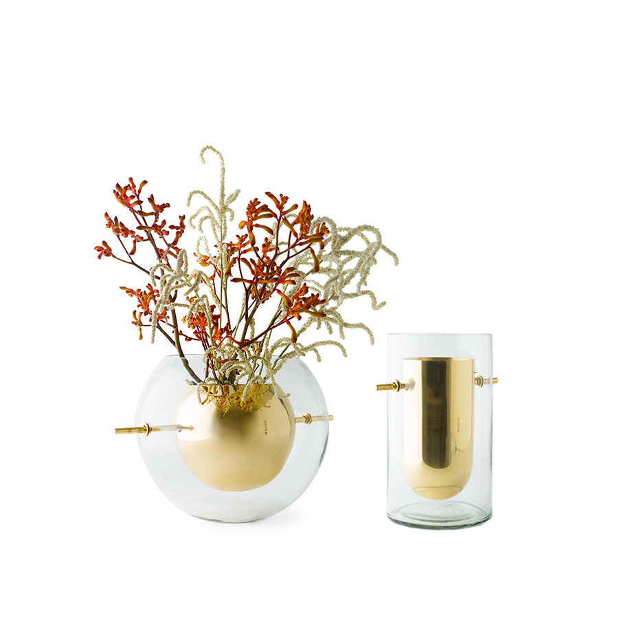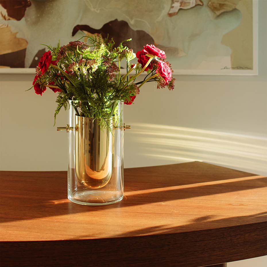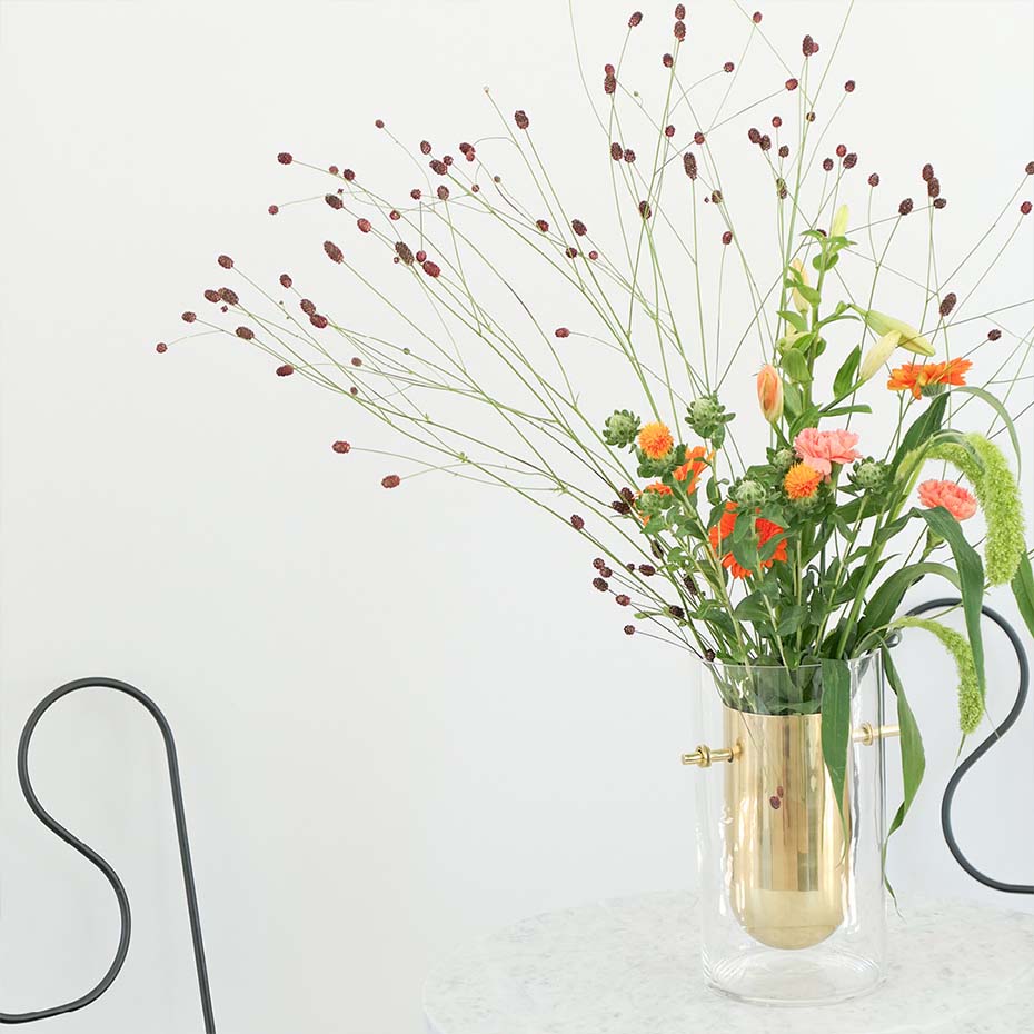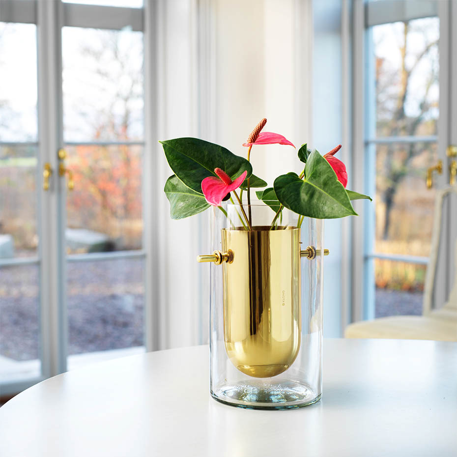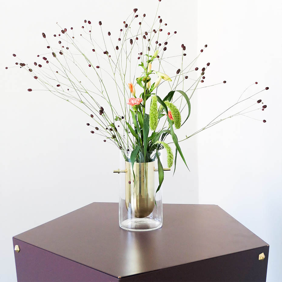 Alba Cylinder Vas från Klong är en modern och elegant vas som utmanar det traditionella sättet att arrangera blommor. Den består av munblåst glas och en gyllene mässingskula som formar den perfekta vinkeln för snittblommor och skapar ett harmoniskt stilleben. Med sin skulpturala form blir Alba både en funktionell vas och ett dekorativt statement i hemmet.