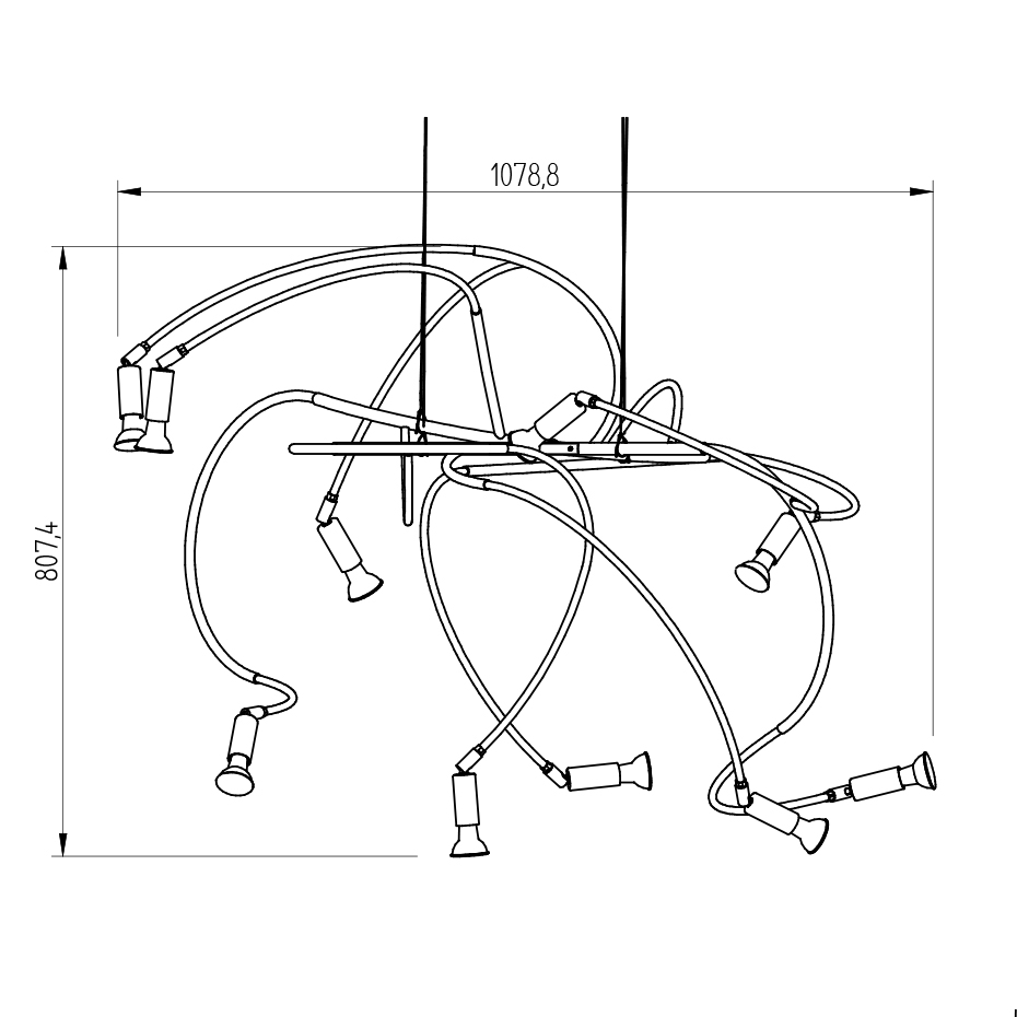 Bredd: 107,88 cm Djup: 118,8 cm Höjd: 80,74 cm Ljuskälla: Ingår ej Material: Lackerad metall/Mässing/Koppar Sladdlängd: 2,5 m Sockel: 10 x E14, Max 40 W Övrigt: Har textilkabel och vajerupphäng
