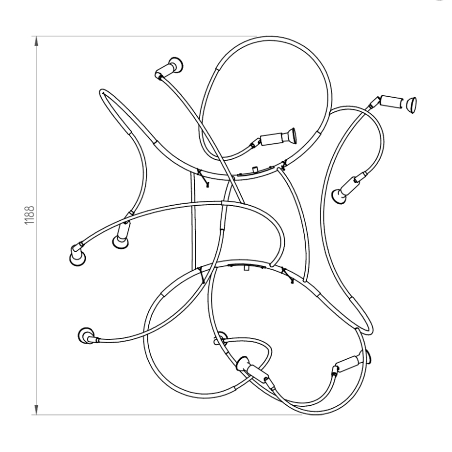 Bredd: 107,88 cm Djup: 118,8 cm Höjd: 80,74 cm Ljuskälla: Ingår ej Material: Lackerad metall/Mässing/Koppar Sladdlängd: 2,5 m Sockel: 10 x E14, Max 40 W Övrigt: Har textilkabel och vajerupphäng