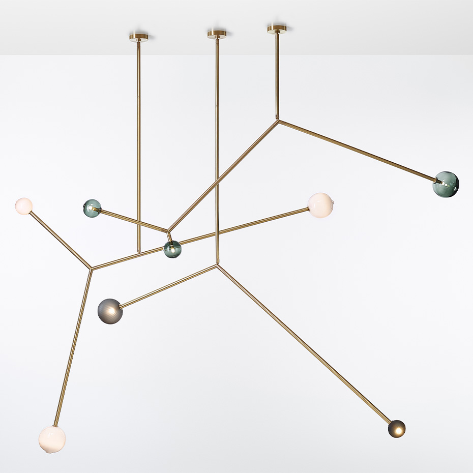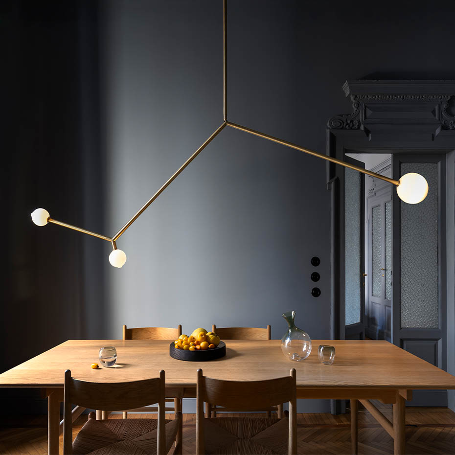 Angle 1.0 Pendel från SkLO är en skulptural pendel där en asymmetrisk mässingsstruktur möter munblåsta glaskupor i ett luftigt och dynamiskt uttryck. Varje kupa är unik i vikt och form, vilket skapar subtila variationer i lampans balans och karaktär – en del av designens avsikt att framhäva hantverket och ge varje armatur sin egen personlighet.