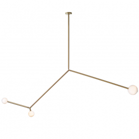 Angle 3.0 Pendel från SkLO är en skulptural pendel där en asymmetrisk mässingsstruktur möter munblåsta glaskupor i ett luftigt och dynamiskt uttryck. Varje kupa är unik i vikt och form, vilket skapar subtila variationer i lampans balans och karaktär – en del av designens avsikt att framhäva hantverket och ge varje armatur sin egen personlighet.