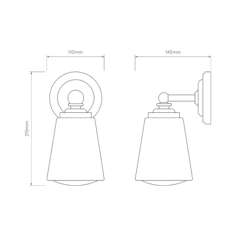 Diameter: 11 cm (skärm), 10 cm (fäste) Djup: 14,5 cm Höjd: 21,5 cm IP-klass: 44 Ljuskälla: Ingår ej Material: Metall/Opalglas Montering: För fast montage Sockel: E14, Max 40 W