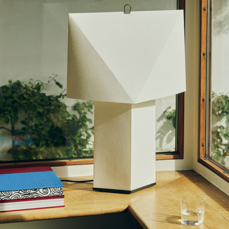 Aplat Bordslampa 660 White från Hay, designad av den franska designduon CPRV, är den största modellen i serien och imponerar med sin lätta, skulpturala form i vikt papper. Denna designlampa levereras som ett platt paket och monteras ihop av användaren, där de precisa linjerna och vinklarna bygger upp en minimalistisk och grafisk volym. Den diffusa pappersytan sprider ett omgivande sken som påminner om levande ljus, vilket skapar en varm och inbjudande atmosfär i ett rymligt vardagsrum.