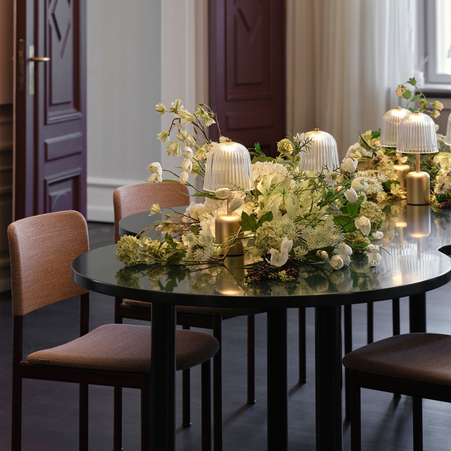 Asteea Bordslampa Portable från Nuura är en trådlös och elegant designlampa inspirerad av blåklockans böljande form. Med sin räfflade skärm i återvinningsbar akryl sprider den ett mjukt, bländfritt ljus nedåt – perfekt för att skapa en harmonisk atmosfär. Den guldfärgade basen ger en varm reflektion och en lyxig touch till din ljussättning. Eftersom lampan är laddningsbar via USB-C och anpassad för både inomhus- och utomhusbruk, är den en otroligt flexibel bärbar bordslampa.
