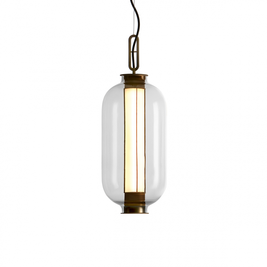 Bai T BA BA Pendel från Parachilna är en sofistikerad och modern tolkning av den klassiska kinesiska lyktan, där en omsorgsfullt handblåst lampkupa i transparent glas möter en elegant struktur i patinerad brons. Med sin unika form och exklusiva materialval blir denna designlampa ett vackert blickfång över ett matbord eller i ett större vardagsrum, där den balanserar industriell tyngd med glasets skira lätthet.