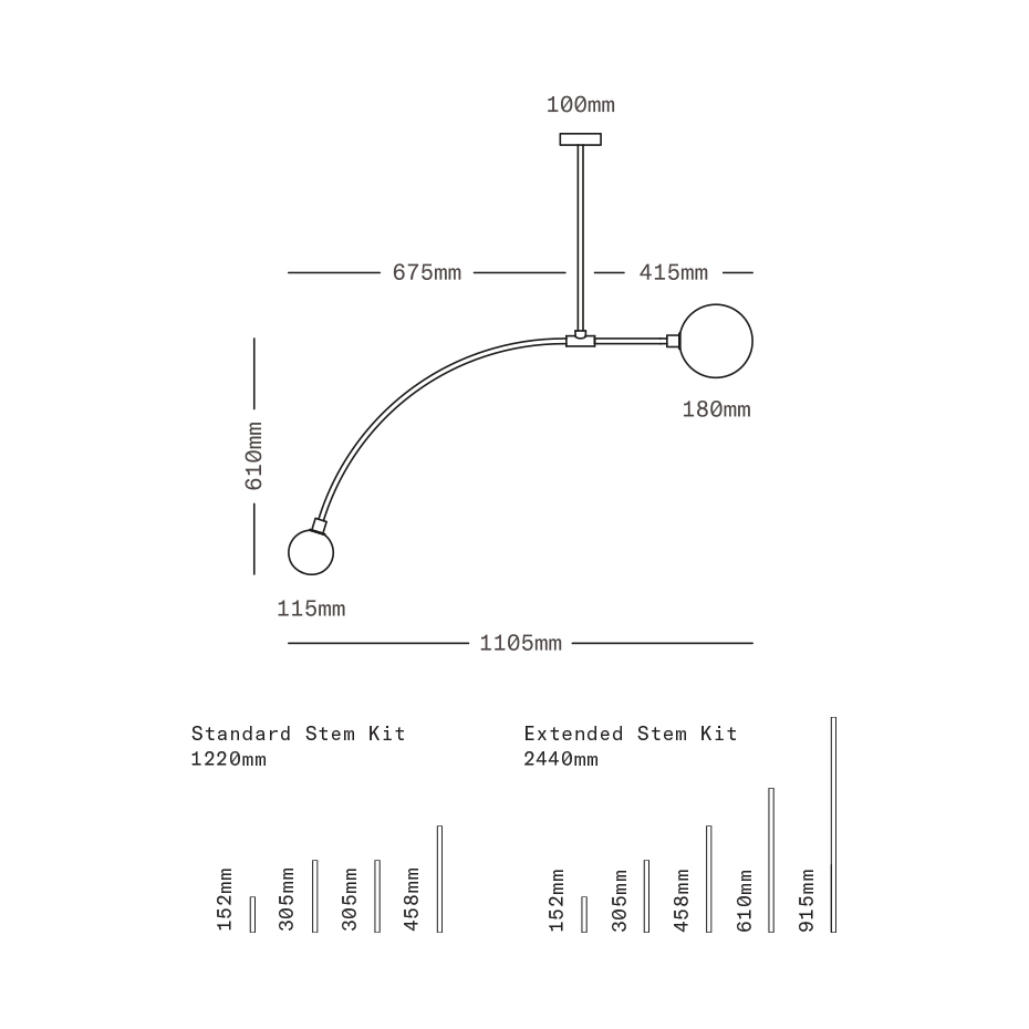 Armaturen levereras med ett justerbart stångsystem i flera längder (15,2 cm, 30,5 cm, 30,5 cm och 45,8 cm) som kan kombineras för önskad totallängd.
