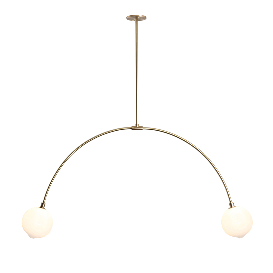 Balance 2.0 Pendel från SkLO är en elegant och symmetrisk pendel där två böjda mässingsarmar bär handblåsta glaskupor av tjeckiskt glas. Formen präglas av balans, enkelhet och rörelse, vilket gör lampan lika vacker över ett matbord som i höga rum där den får komma till sin rätt.