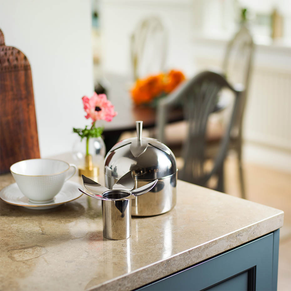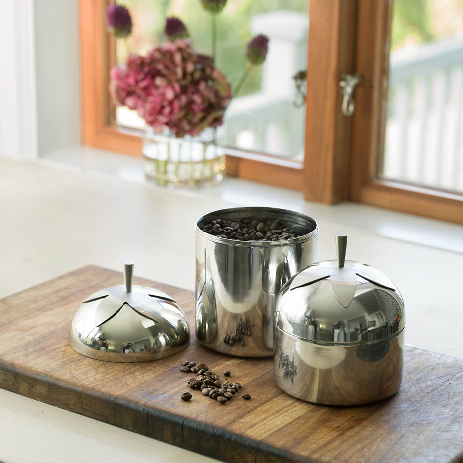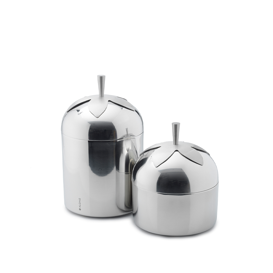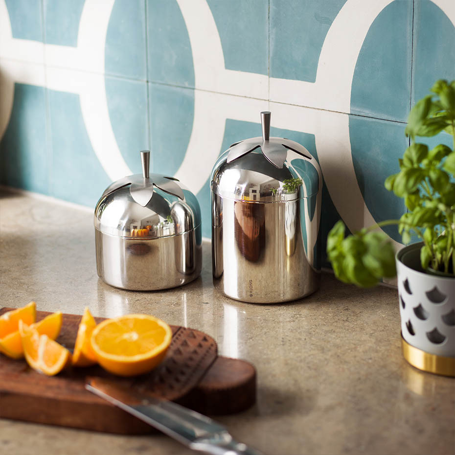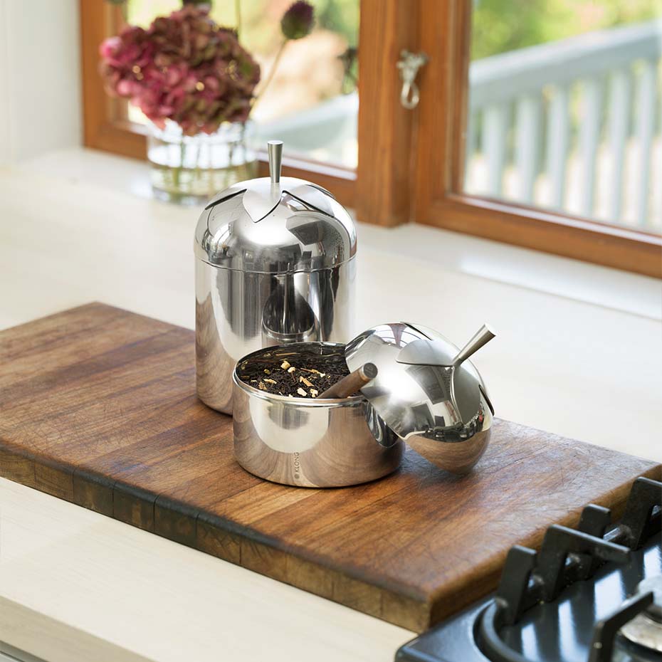 Blad Burk Stål från Klong är en elegant uppdatering av Eva Schildts populära te- och kaffeburkar. Tillverkad i rostfritt stål med vacker kontrast mellan matt och blank yta, och komplett med en praktisk liten sked. Perfekt för te, kaffe eller småförvaring.