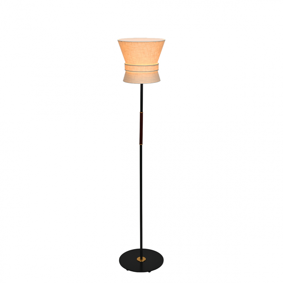 Diameter: 28 cm (skärm) Höjd: 146,5 cm Ljuskälla: Ingår ej Material: Lackerad metall/Textil/Brun läderskoning Sladdlängd: 2,5 m Sockel: E27, Max 60 W Övrigt: Dimmer på sladden