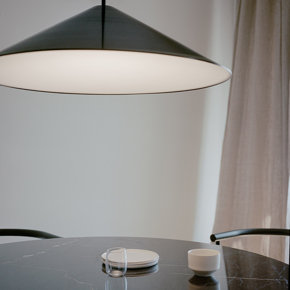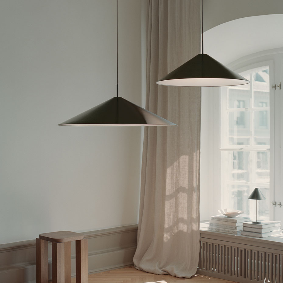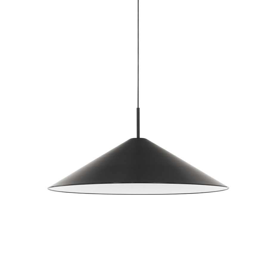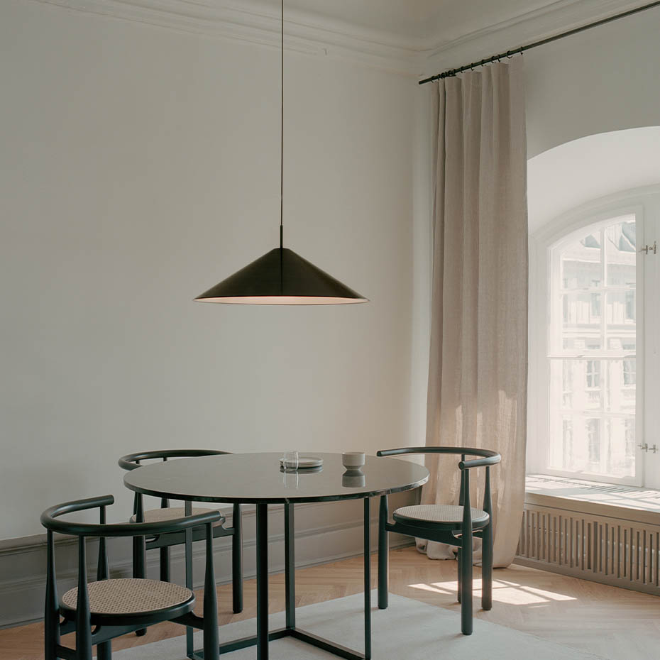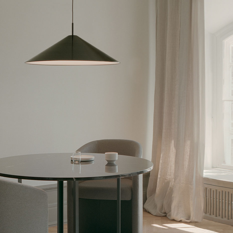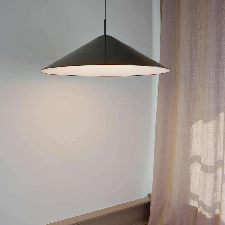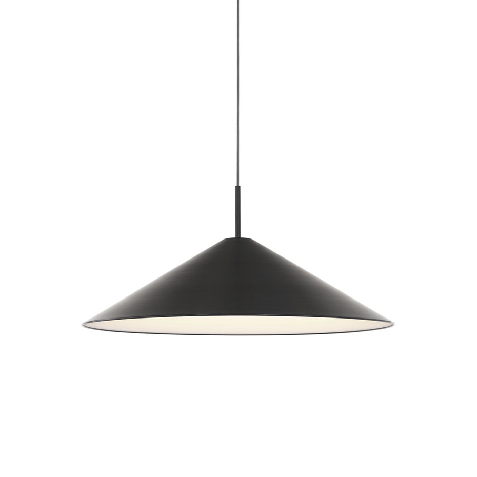 Brolly Pendel Ø70cm från New Works visar styrkan i enkel och genomtänkt formgivning. Med sin precisa koniska silhuett förenar den arkitektonisk skärpa med ett tidlöst uttryck som passar i de flesta miljöer. Den konkava diffusorn sprider ett mjukt och behagligt ljus utan att blända, vilket gör lampan perfekt att placera över matbordet eller som ett elegant blickfång i rummet. En pendel som kombinerar funktion, estetik och lugn harmoni i ett.