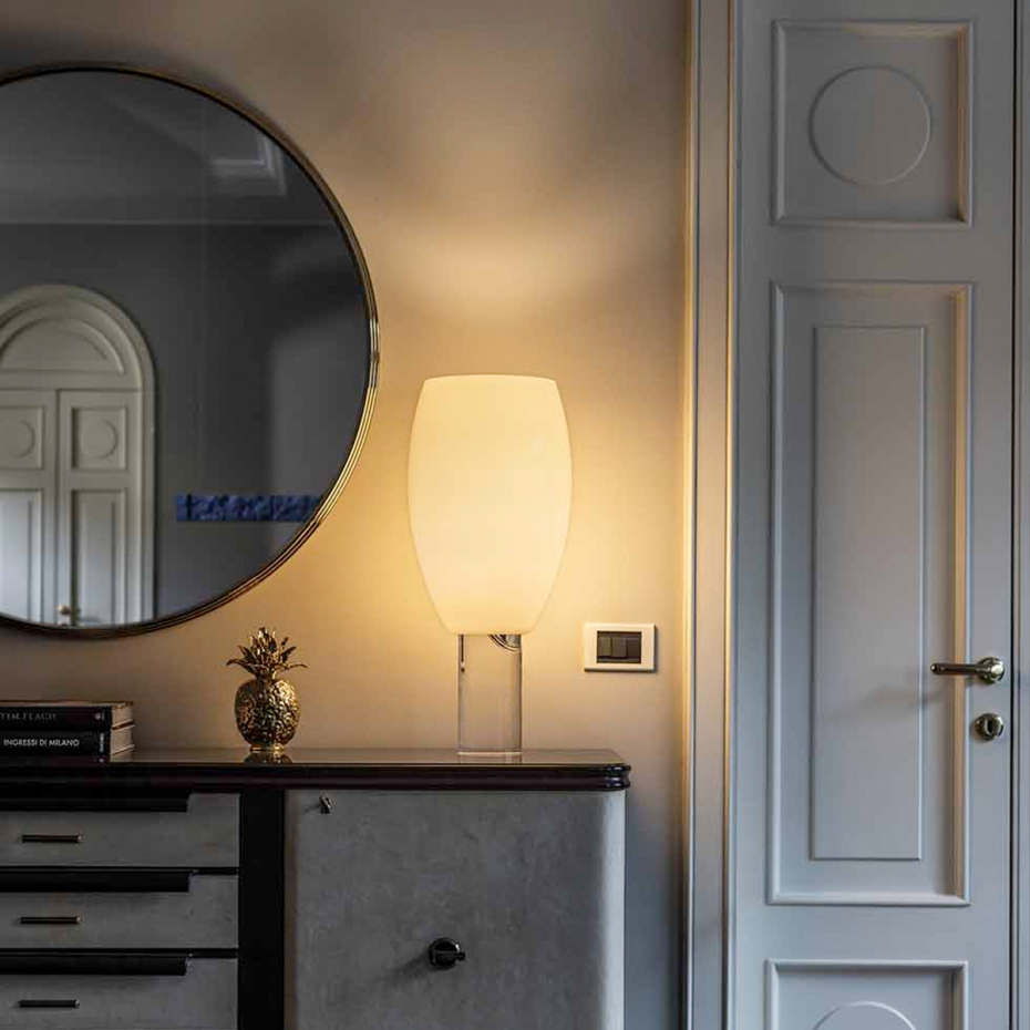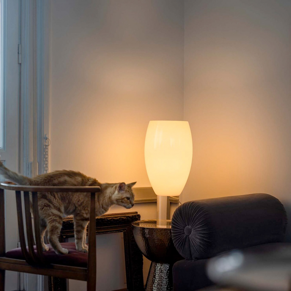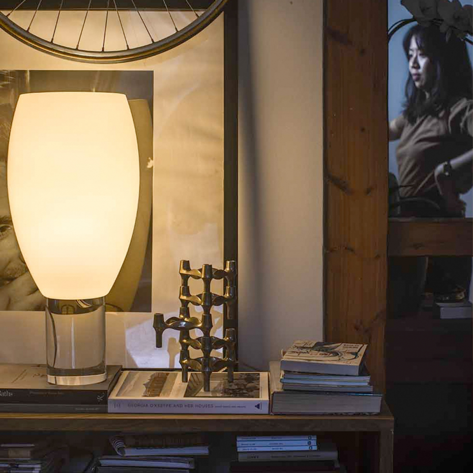 Buds 1 Bordslampa från Foscarini utmärker sig med sin höga, slanka skärm i munblåst glas, handtillverkad i hela fem lager för en oöverträffad lyster. Denna designlampa har en unik personlighet som skiftar med ljuset; den upplevs svalt elegant när den är släckt, men sprider ett djupt och varmt sken så snart den tänds. Med sitt gedigna hantverk och sin sofistikerade siluett blir Buds 1 ett stilrent inslag som tillför en lyxig känsla och en behaglig ljussättning till ditt hem.