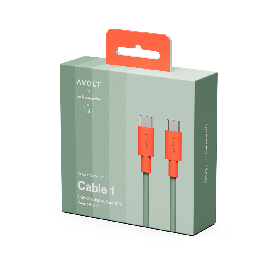 Cable 1 USB-C to USB-C (100W) 2m Bauhaus-Archiv Edition Gecko Bloom från Avolt tillhör den limiterade Bauhaus-Archiv-kollektionen och förenar funktionell teknik med ett uttrycksfullt färgval inspirerat av Bauhaus-rörelsens tydliga former och lekfulla modernism.