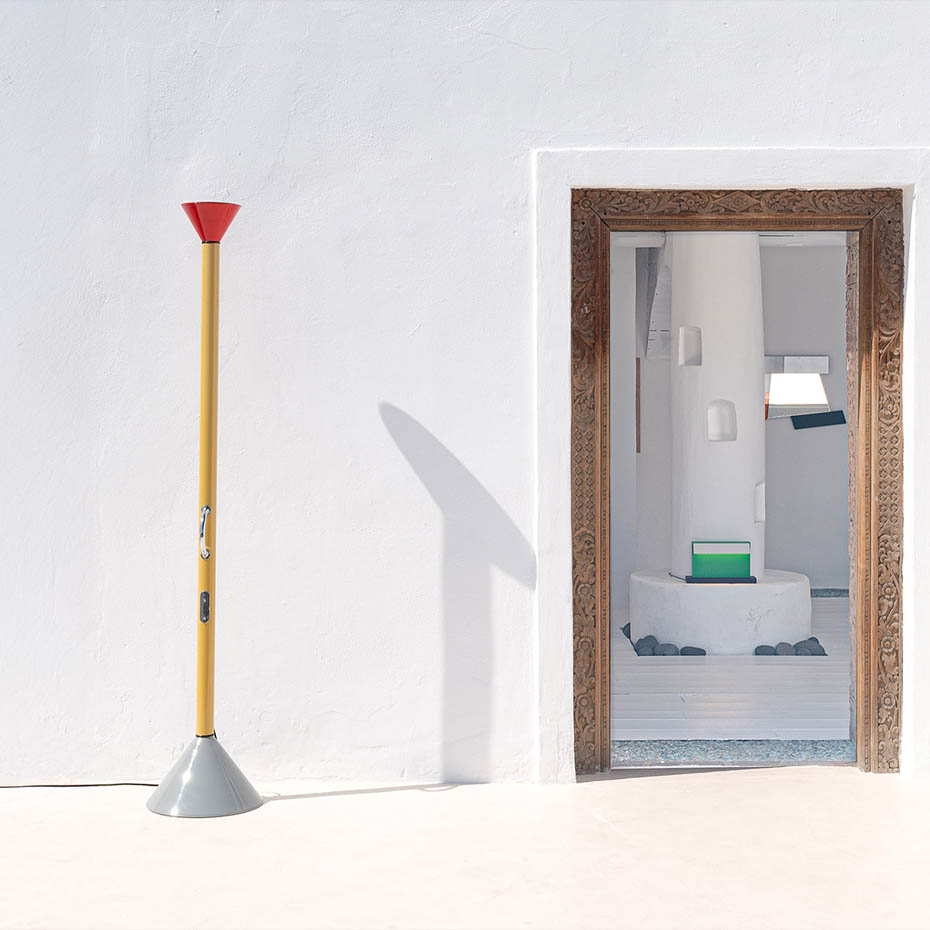Callimaco LED Golvlampa från Artemide är en ikon från Radical Design, skapad av Ettore Sottsass. Med sina starka färger, geometriska former och det karakteristiska handtaget förvandlar den ett vardagsobjekt till ett uttrycksfullt och konstnärligt designstatement.