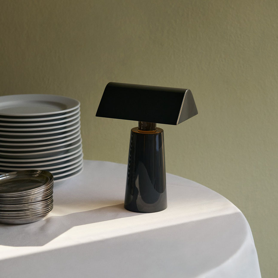 Caret Bordslampa från &tradition tar inspiration från de traditionella lamporna som finns i allmänna bibliotek, den mångsidiga Caret sprider ett mjukt ljus från den pyramid liknande formen och passar lika bra som sänglampa eller läslampa.