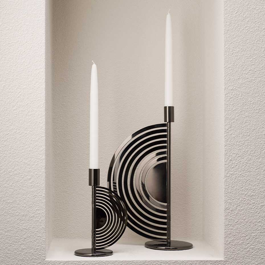 Cirkus Ljushållare från Klong är en lekfull design av Eva Schildt, skapad i mässing eller svart finish. Ljusstaken består av rörliga halvcirklar som kan vridas för att skapa olika uttryck och former. Finns i två storlekar och ger både variation och elegans till dukningen.