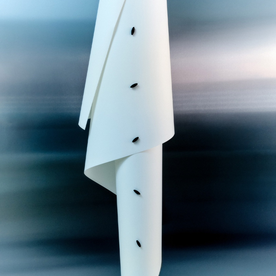 Costura Golvlampa från Parachilna är en elegant och avskalad golvarmatur där en skärm i PVC-papper sveps runt en texturerad svart stålmast och fästs med små, dekorativa knappar. Denna konstruktion ger en tydlig hantverkskaraktär och gör att denna designlampa blir ett stilrent men intressant inslag i ditt vardagsrum.