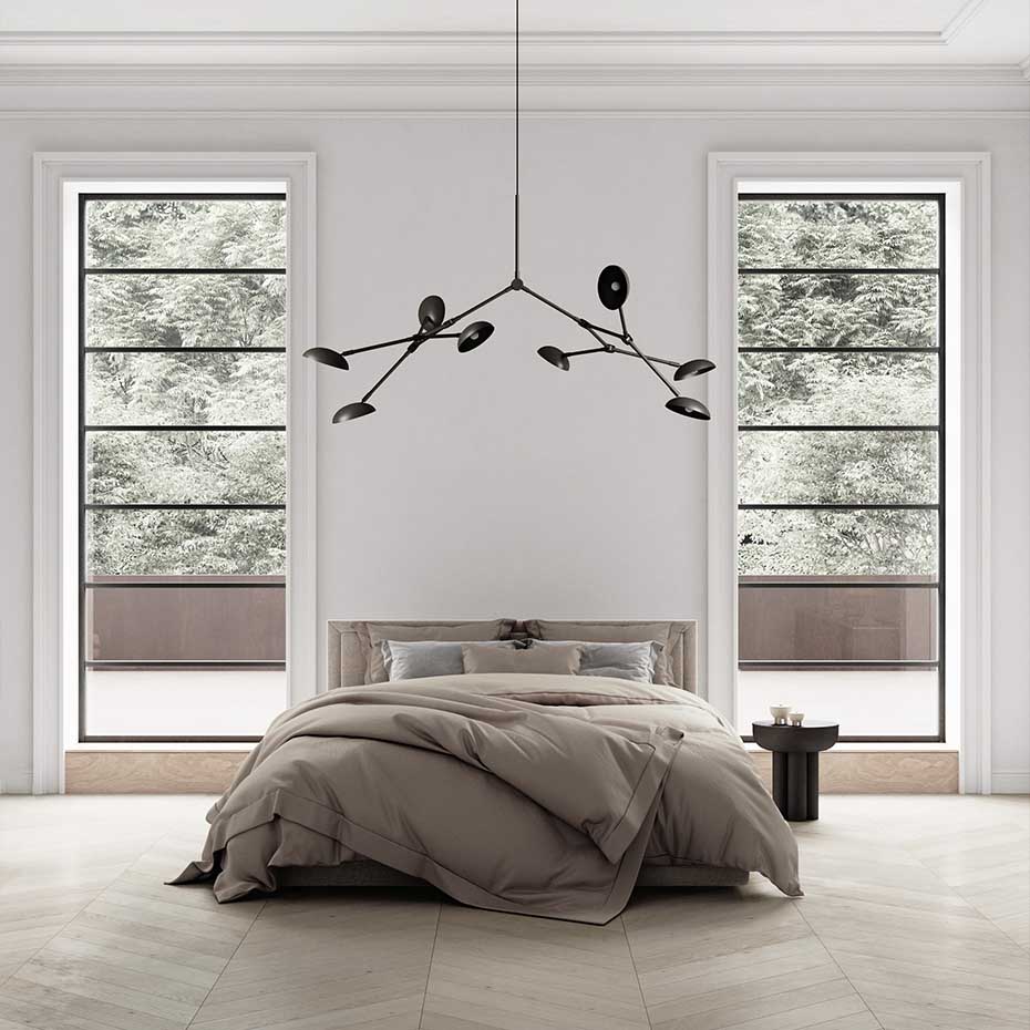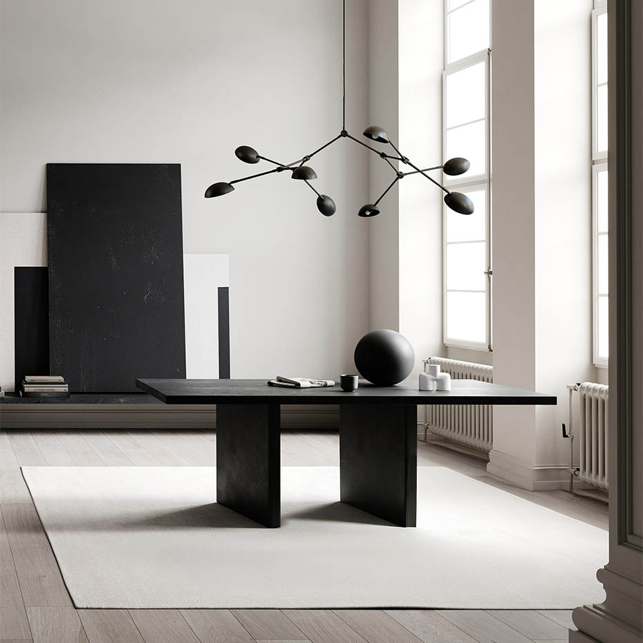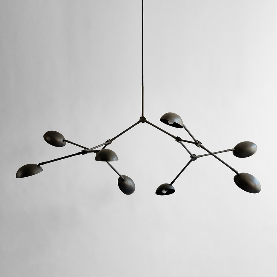 Ljuskronans 14 flexibla, justerbara armar möjliggör oändliga kompositioner och vinklar, medan de mjukt välvda skärmarna skapar ett dynamiskt ljusspel. Varje detalj är noggrant utformad och finns i råoxiderad yta samt tre sofistikerade metaller – mässing, brons och burned black – där den handborstade finishen ger ett hantverksmässigt uttryck.
