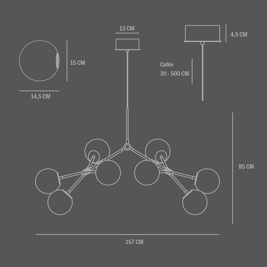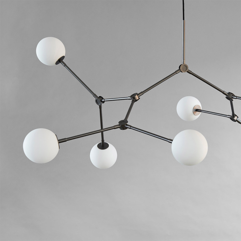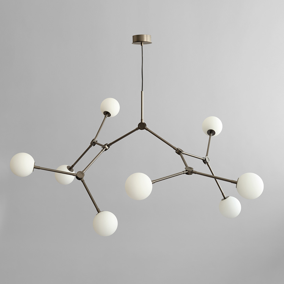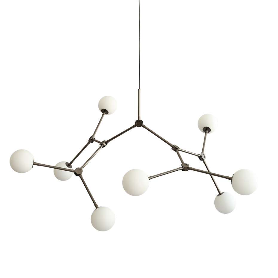 De 14 justerbara armarna ger oändliga variationsmöjligheter och skapar en dynamisk ljusupplevelse. Med sitt varma sken blir Drop Chandelier både en ljuskälla och ett skulpturalt inslag i rummet.