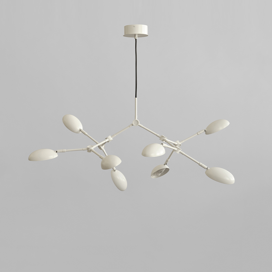 Ljuskronans 14 flexibla, justerbara armar möjliggör oändliga kompositioner och vinklar, medan de mjukt välvda skärmarna skapar ett dynamiskt ljusspel. Varje detalj är noggrant utformad och finns i råoxiderad yta samt tre sofistikerade metaller – mässing, brons och burned black – där den handborstade finishen ger ett hantverksmässigt uttryck.