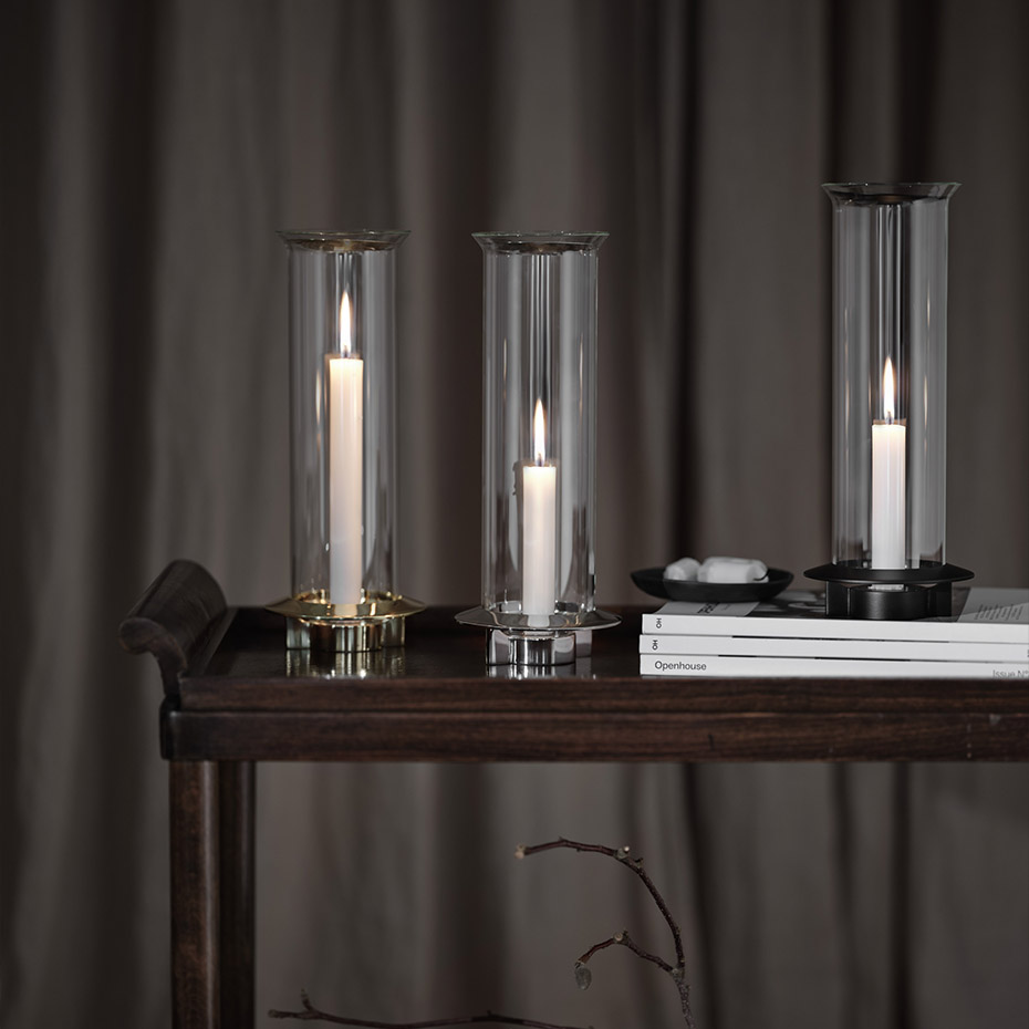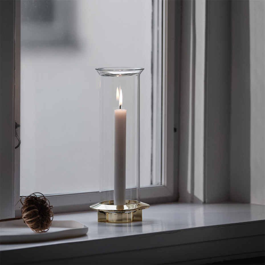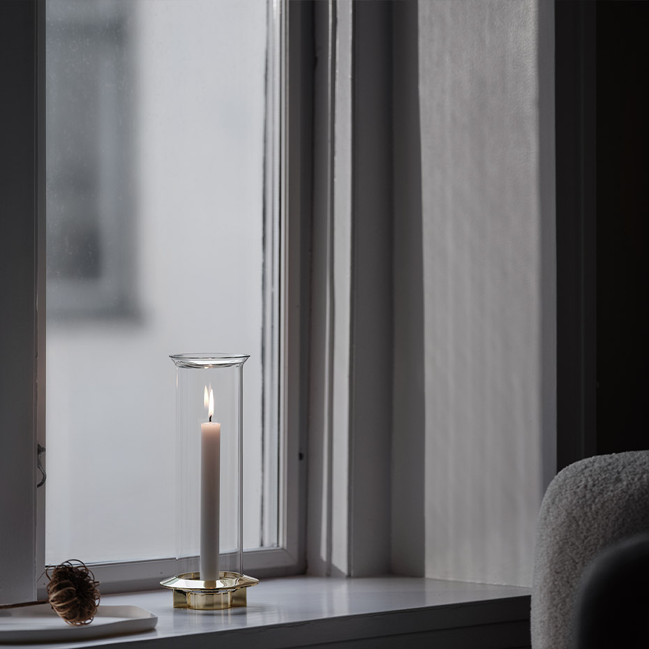 Fyr Ljushållare från Klong är en elegant lykta som förenar enkelhet och funktion. Med glas som skyddar lågan mot drag men ändå ger syrecirkulation sprider den ett varmt, behagligt sken. Finns i stål, mässing och mattsvart – där den svarta även kan användas utomhus.