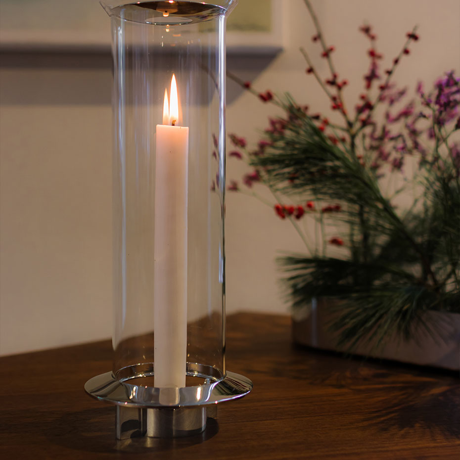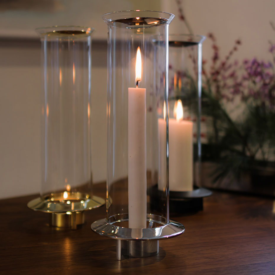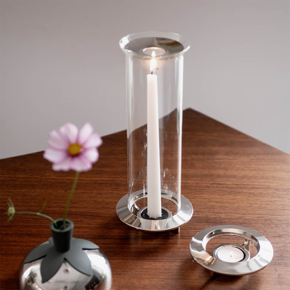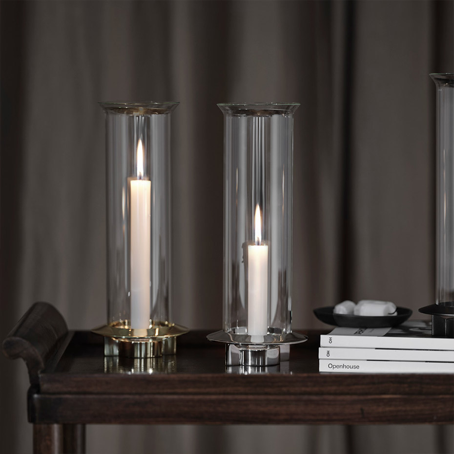 Fyr Ljushållare från Klong är en elegant lykta som förenar enkelhet och funktion. Med glas som skyddar lågan mot drag men ändå ger syrecirkulation sprider den ett varmt, behagligt sken. Finns i stål, mässing och mattsvart – där den svarta även kan användas utomhus.