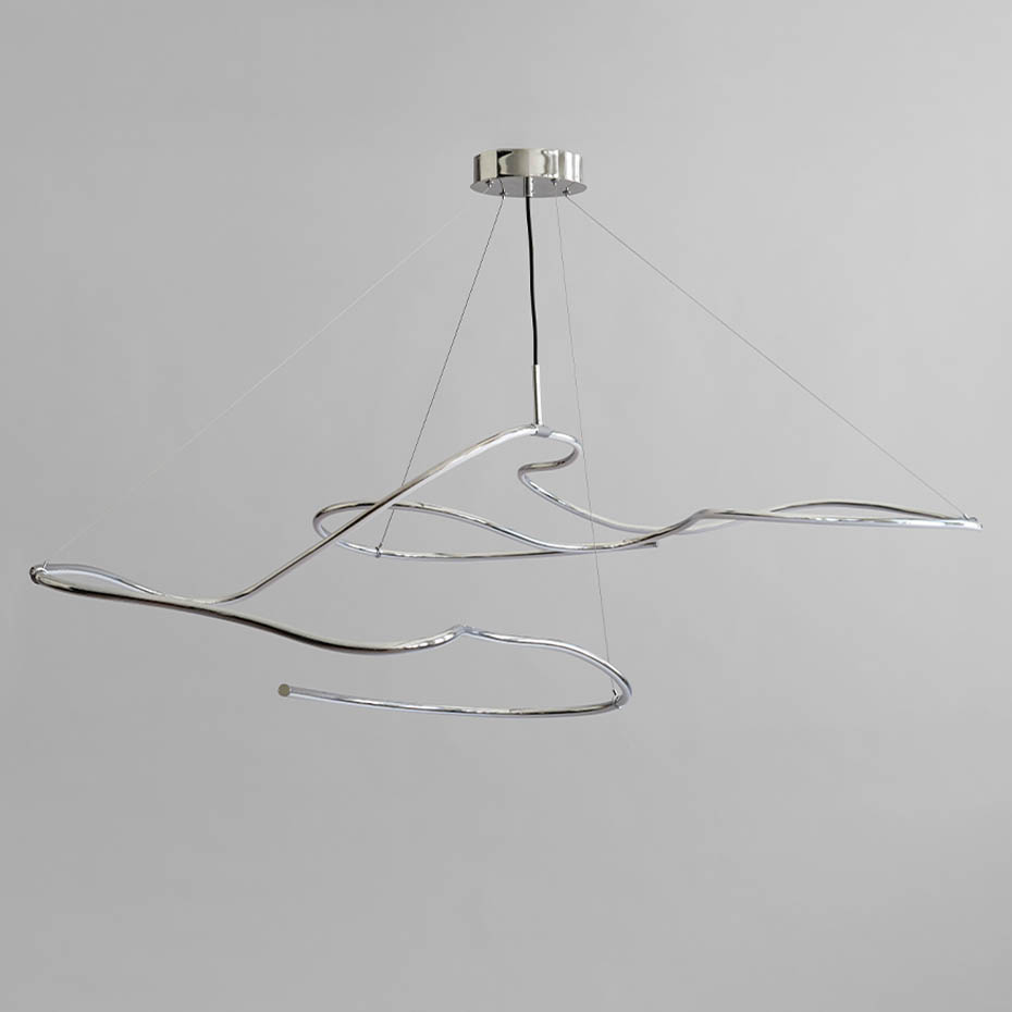 Ljuskronan finns i tre utföranden – Neon, Burned Black och Chrome – samt två storlekar, med en inbyggd LED-ljuskälla som ger 25 000 timmars varmt ljus (2400 K). Den handgjorda designen sprider ljuset unikt längs de böljande rören, vilket ger en levande effekt.