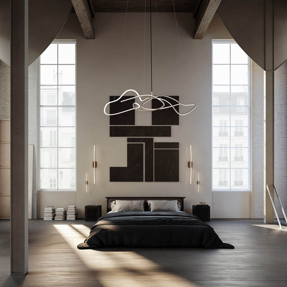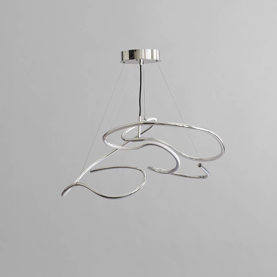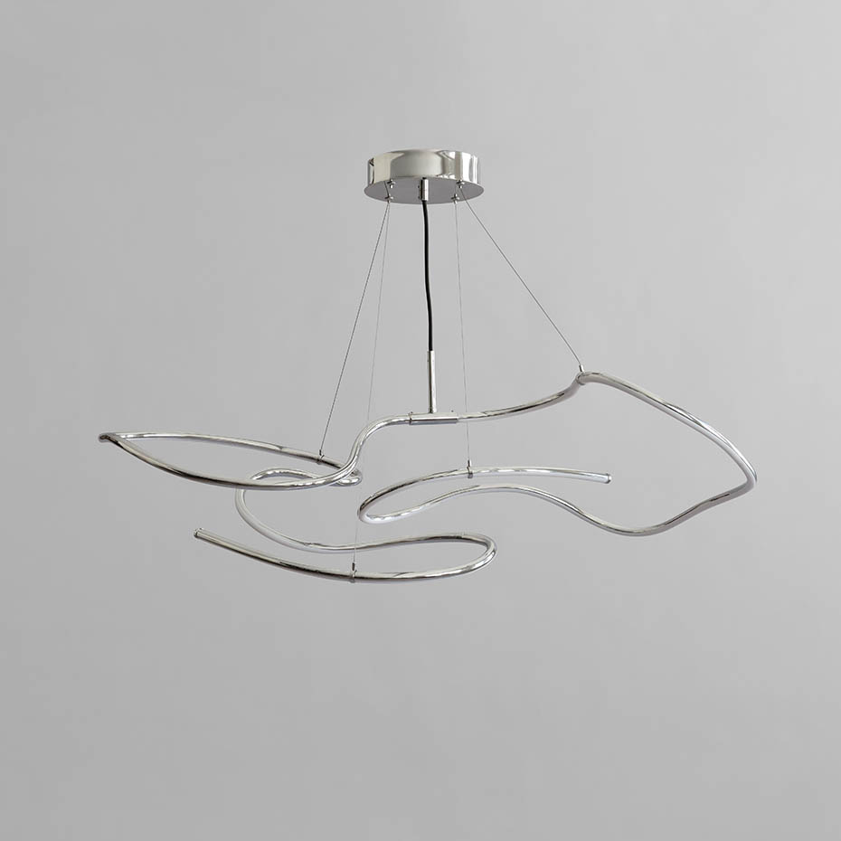 Ghost Chandelier inspireras av minimalistisk konst och förenar ljus med skulptur i en grafisk ljusestetik. Dess signatur är ett strålande vitt akrylrör som slingrar sig organiskt, skapar stämningsfull belysning och förändras beroende på betraktarens vinkel.