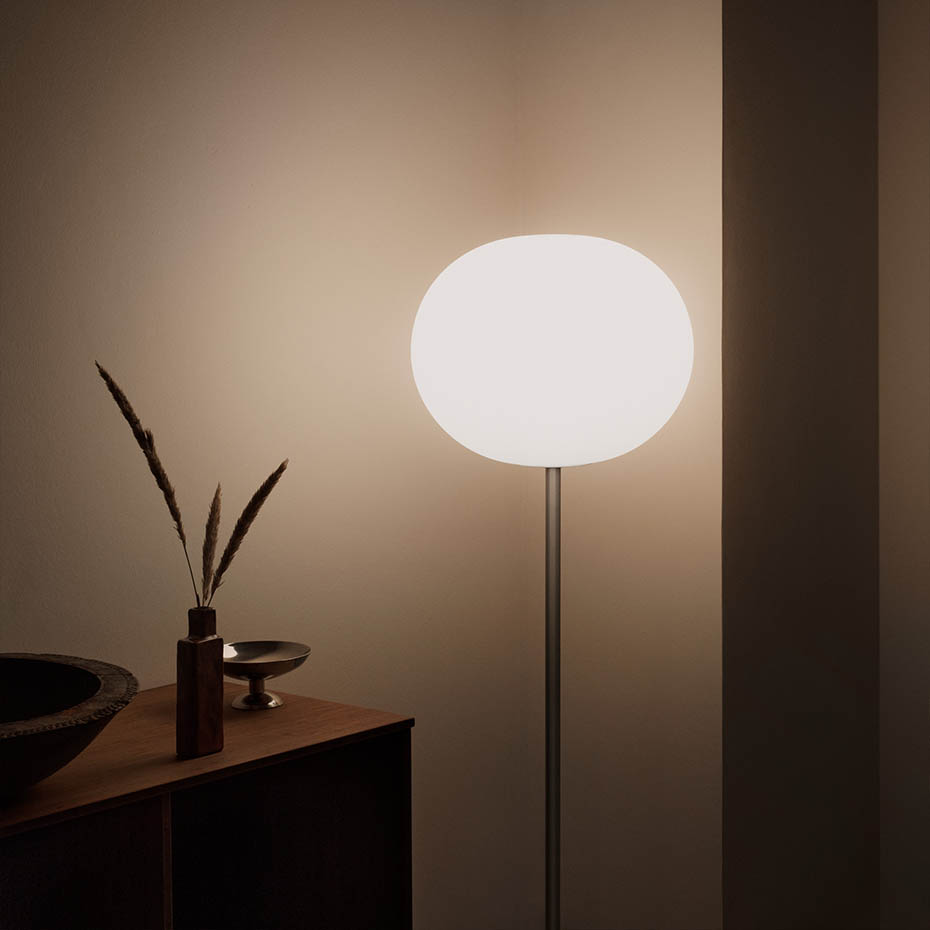 Första lampan i Glo-ball serien ritades 1998 av engelsmannen Jasper Morrison. Den blev snabbt en storsäljare och därefter har serien vuxit med fler modeller och storlekar. Lampan ger ett mjukt och behagligt ljus - och blir extra bra tillsammans med en dimmer.