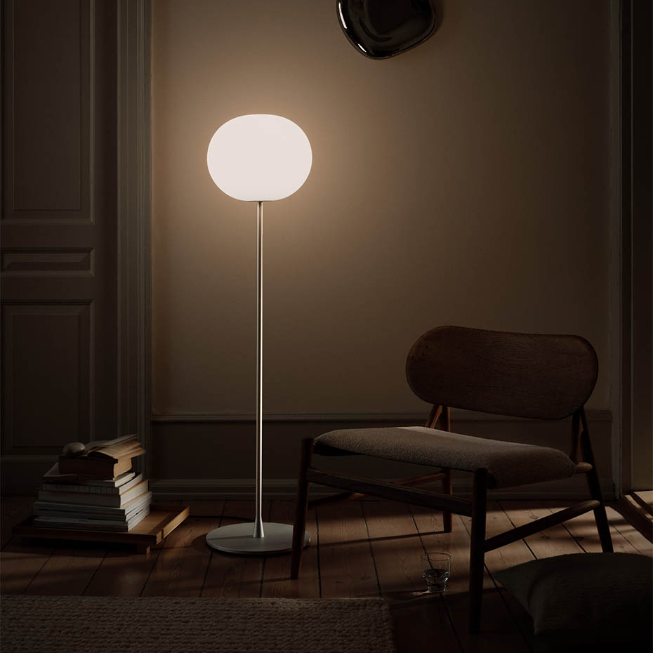 Första lampan i Glo-ball serien ritades 1998 av engelsmannen Jasper Morrison. Den blev snabbt en storsäljare och därefter har serien vuxit med fler modeller och storlekar. Lampan ger ett mjukt och behagligt ljus - och blir extra bra tillsammans med en dimmer.