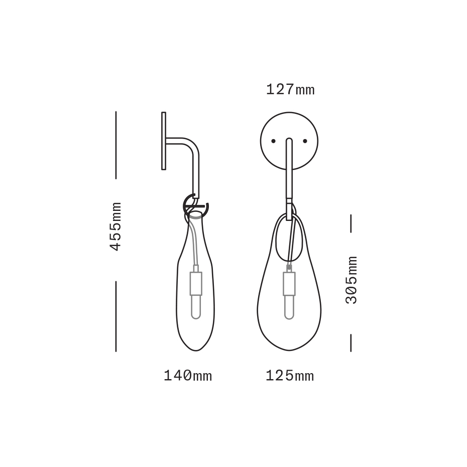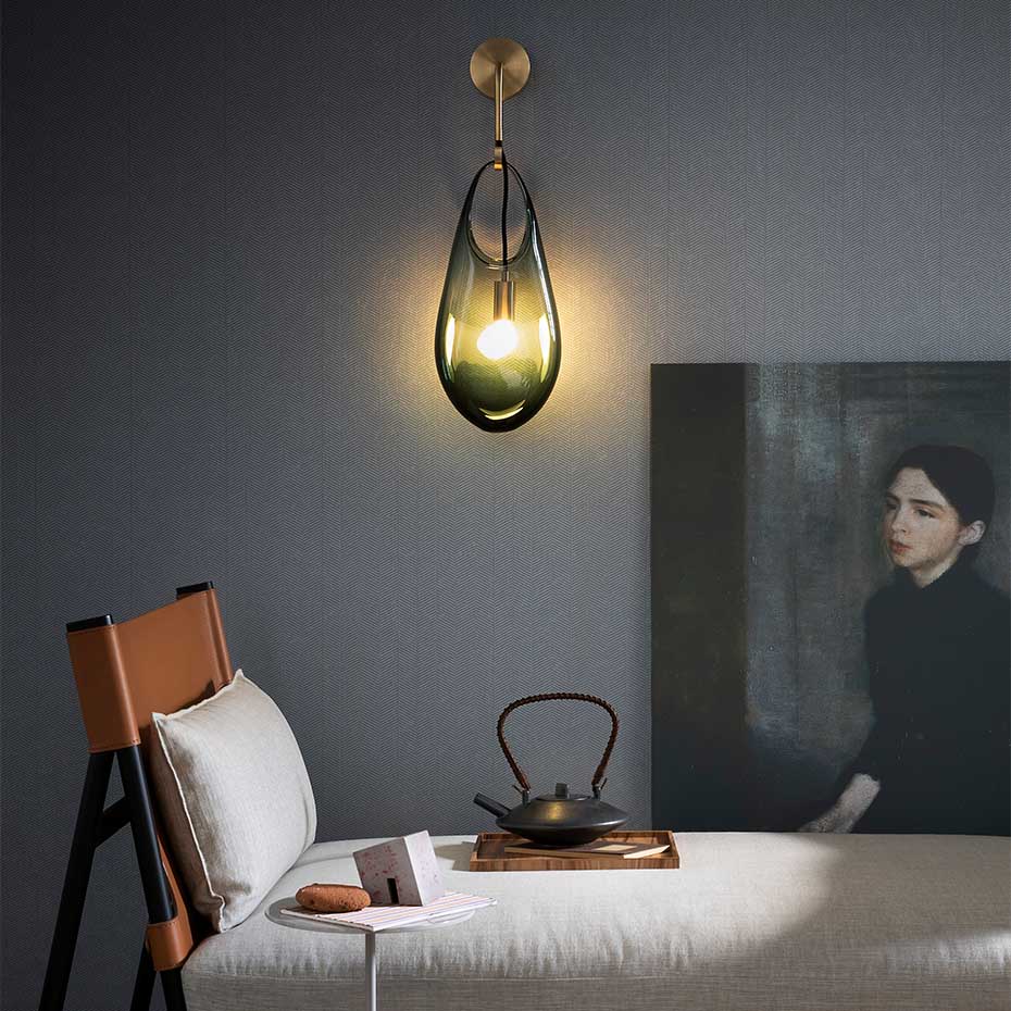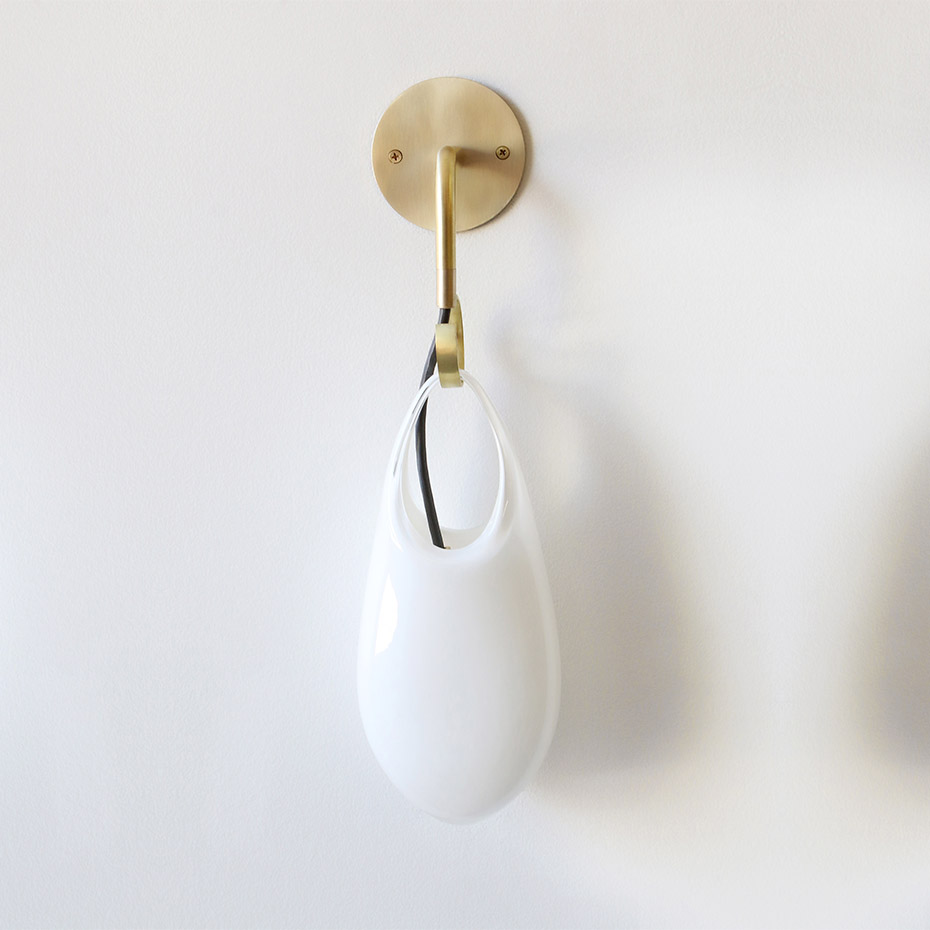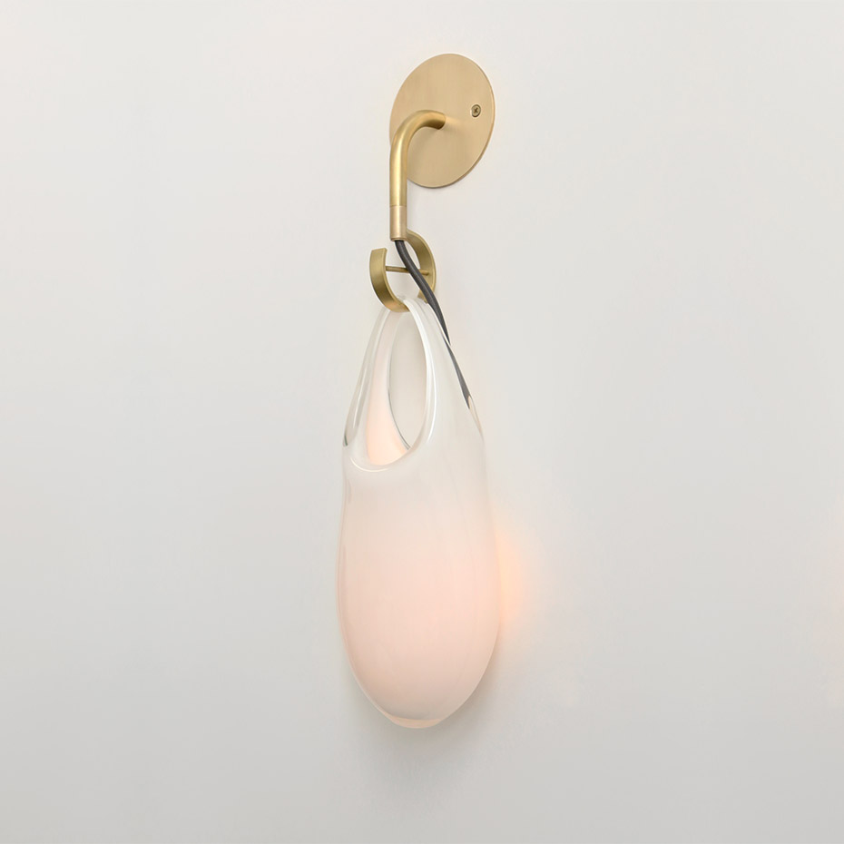 Hold 12 Vägglampa från SkLO är en skulptural vägglampa där den munblåsta glaskupan ser ut att mjukt droppa från sin krok, som om den vore smält. Ljuskällan hänger i en textilklädd kabel från mässingskroken och svävar fritt inuti glaset, vilket skapar ett levande och organiskt uttryck. En avtagbar gängad pinne i kroken gör det möjligt att fästa glaset mer stabilt vid behov.