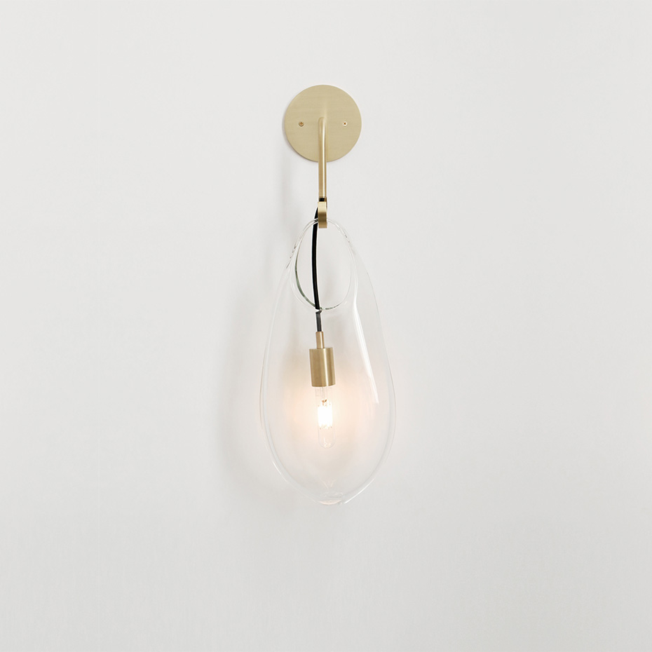 Hold 18 Vägglampa från SkLO är en skulptural vägglampa där den munblåsta glaskupan ser ut att mjukt droppa från sin krok, som om den vore smält. Ljuskällan hänger i en textilklädd kabel från mässingskroken och svävar fritt inuti glaset, vilket skapar ett levande och organiskt uttryck. En avtagbar gängad pinne i kroken gör det möjligt att fästa glaset mer stabilt vid behov.