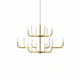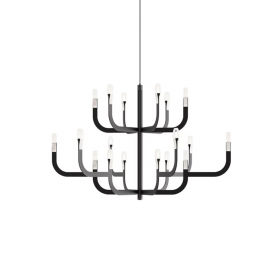 J-us Configuration G från Luceplan är en modern tolkning av den klassiska ljuskronan. Här döljs all teknik och materialforskning bakom en lätt och dynamisk form som sprider ett varmt och behagligt ljus. Den centrala cylindriska strukturen fungerar som en elektrifierad axel där armarna, enkla eller dubbla, fästs och kan justeras fritt genom att skjutas in i spåren. Detta gör det möjligt att skapa olika kompositioner och uttryck, anpassade efter rummets karaktär och användarens önskemål. Resultatet är en ljuskälla med stark visuell närvaro och en raffinerad elegans som aldrig tar över helhetsintrycket.