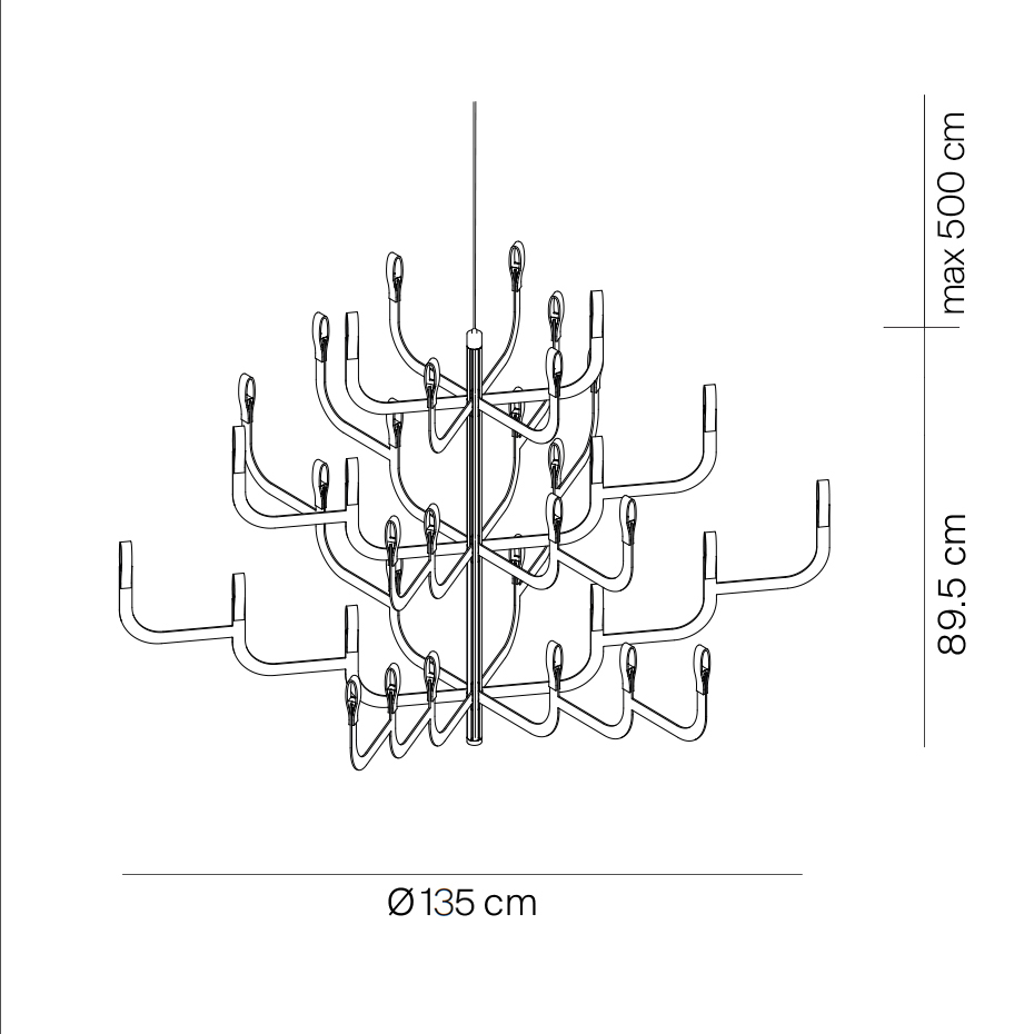 J-us Configuration XL från Luceplan är en modern tolkning av den klassiska ljuskronan. Här döljs all teknik och materialforskning bakom en lätt och dynamisk form som sprider ett varmt och behagligt ljus. Den centrala cylindriska strukturen fungerar som en elektrifierad axel där armarna, enkla eller dubbla, fästs och kan justeras fritt genom att skjutas in i spåren. Detta gör det möjligt att skapa olika kompositioner och uttryck, anpassade efter rummets karaktär och användarens önskemål. Resultatet är en ljuskälla med stark visuell närvaro och en raffinerad elegans som aldrig tar över helhetsintrycket.