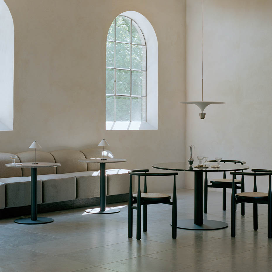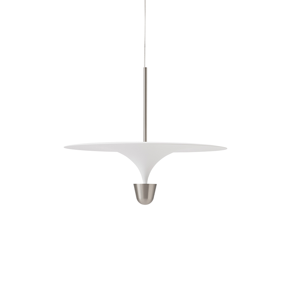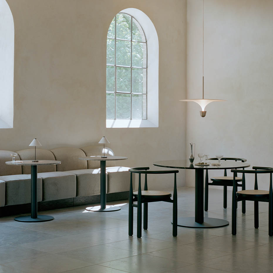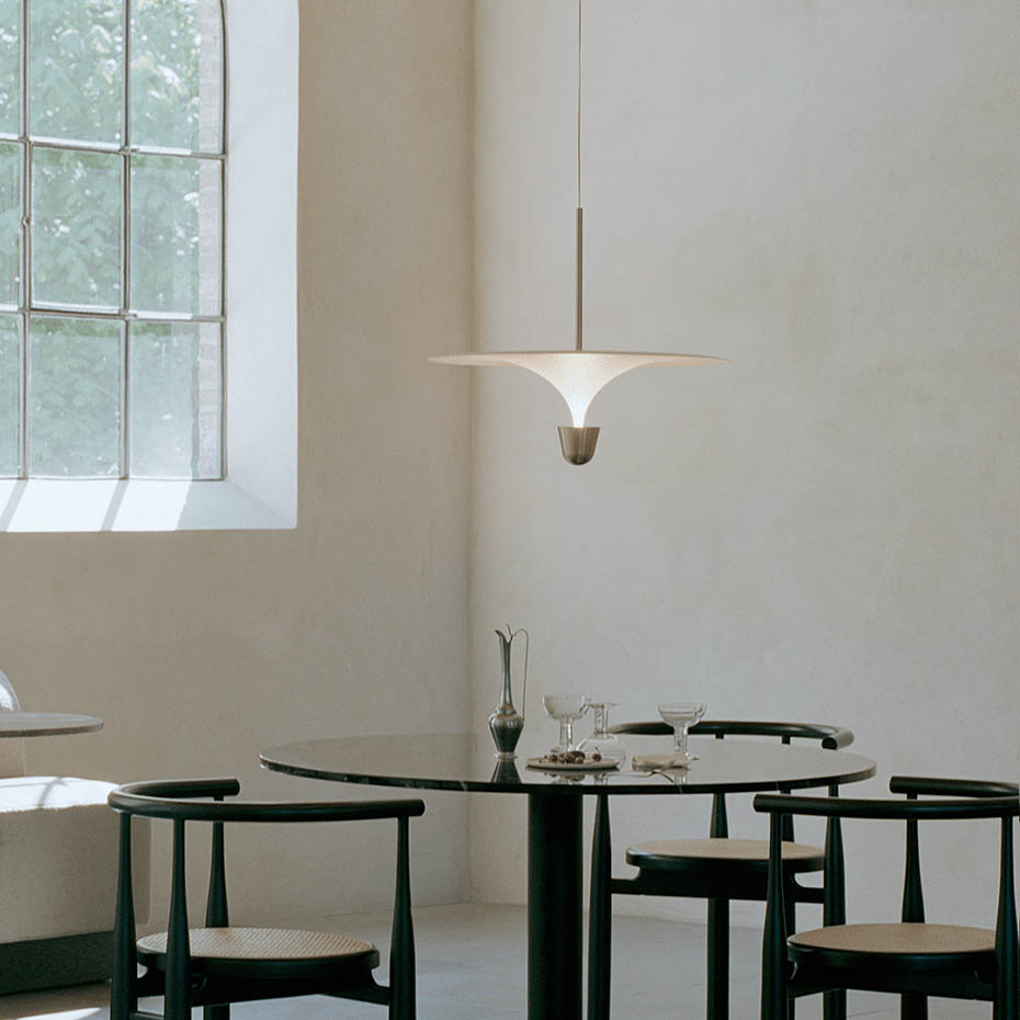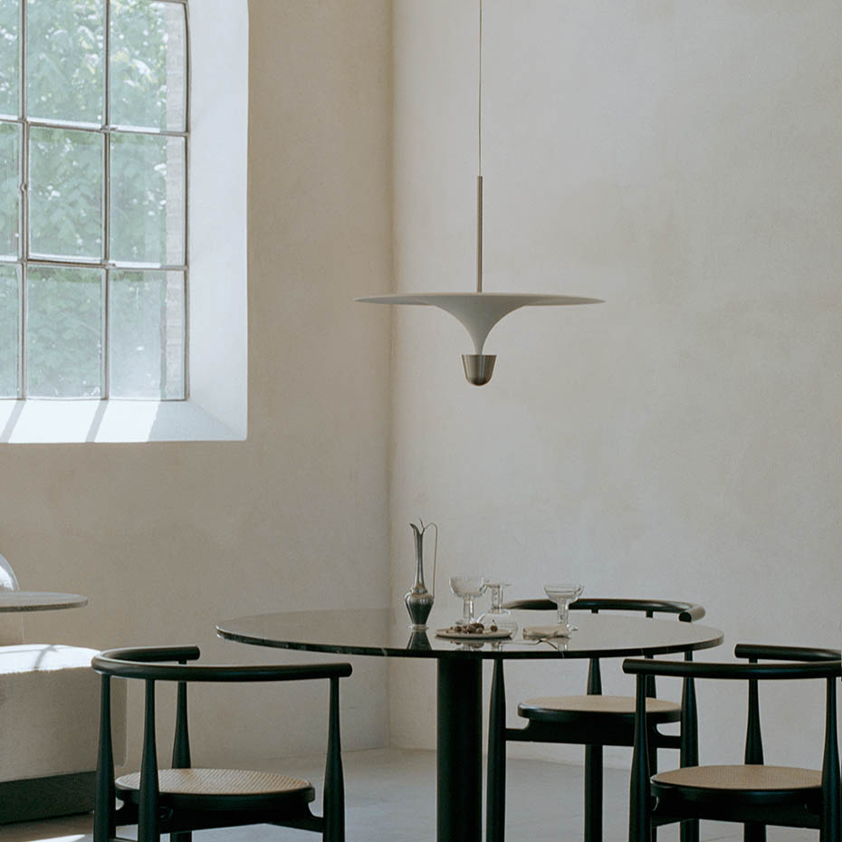 Kantarell Pendel Ø60cm från New Works är resultatet av en studie i hur ljus kan riktas och formas. Med sin trumpetliknande silhuett fungerar den som en tratt som sprider ljuset från en nästan dold ljuskälla i mitten. Formen gör att lampan kan hängas både högt och lågt, vilket framhäver olika sidor av dess poetiska och flytande uttryck, från den välvda undersidan till den mjukt böjda ovansidan. Oavsett placering tillför Kantarell Pendel en skulptural närvaro och ett stämningsfullt ljus till rummet.