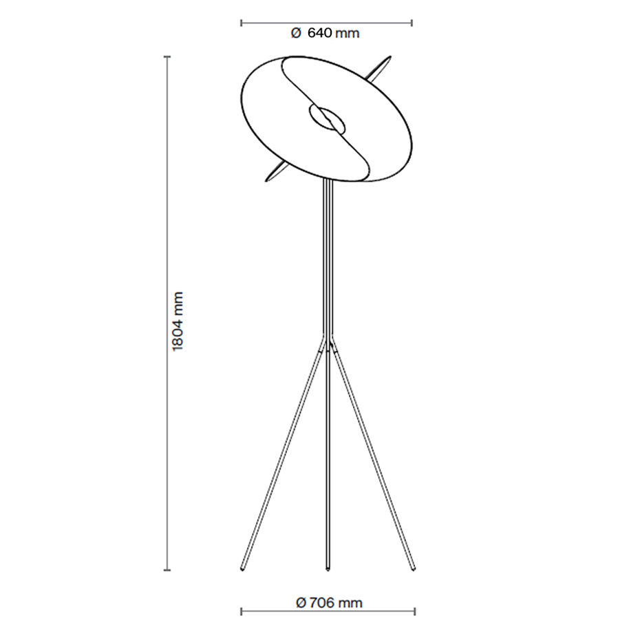 Diameter: 64 cm (skärm), 70,6 cm (fot) Höjd: 180,4 cm Ljuskälla: Integrerad Material: Aluminum/PET Sockel: LED, 22 W 1230 lm 2700K CRI 90 Övrigt: Dimmer på sladden