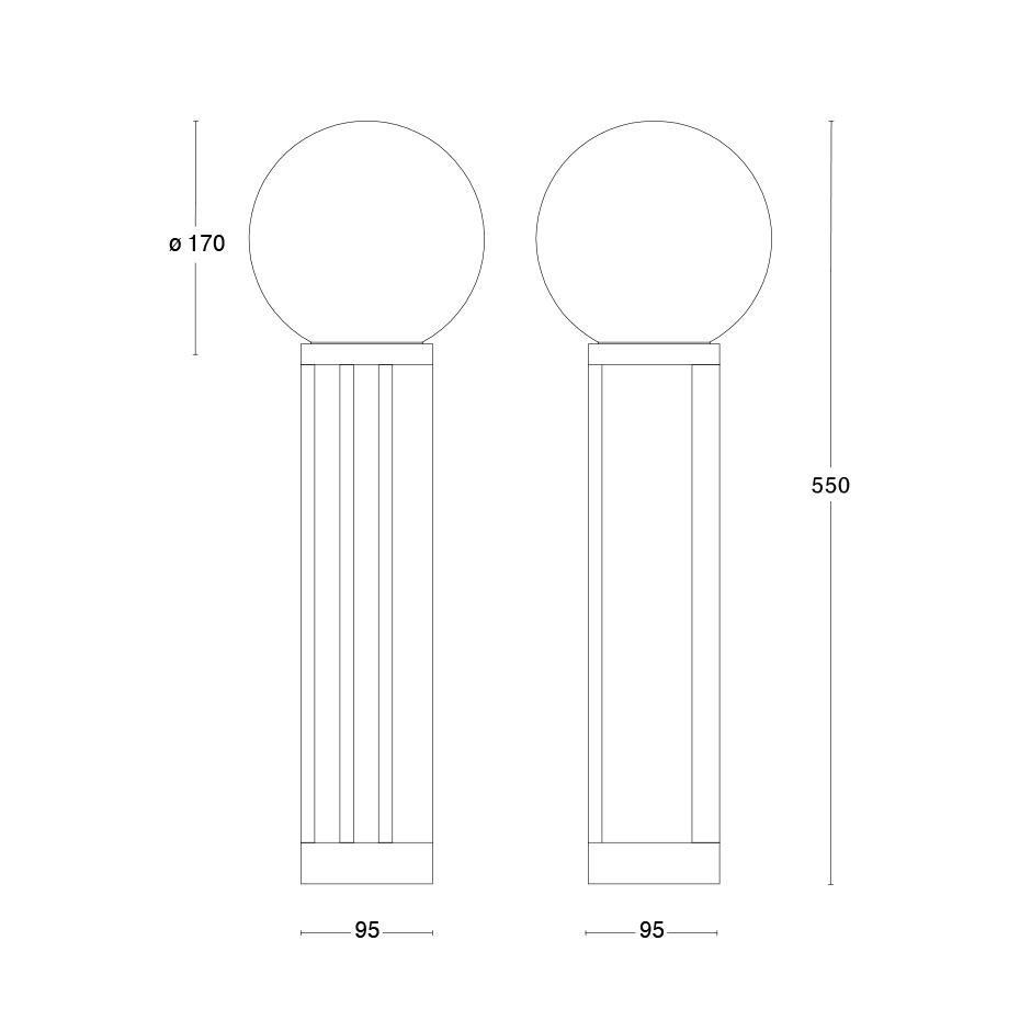 Bredd: 9,5 cm (fot) Diameter: 17 cm (skärm) Djup: 9,5 cm (fot) Höjd: 55 cm Ljuskälla: Ingår ej Material: Pulverlackerat stål/Opalglas Sladdlängd: 2 m Sockel: E27, Max 4 W LED Övrigt: Strömbrytare på sladden