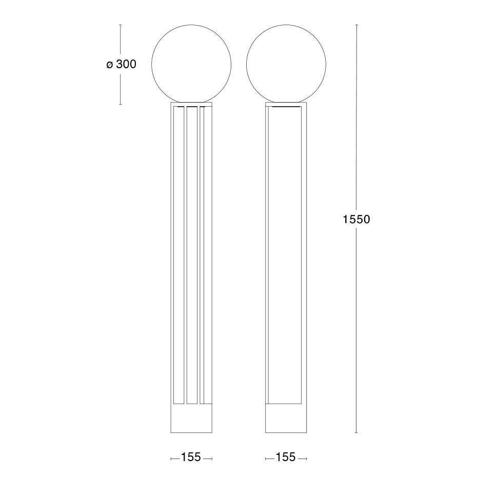 Bredd: 15,5 cm (fot) Diameter: 30 cm (skärm) Djup: 15,5 cm (fot) Höjd: 155 cm Ljuskälla: Ingår ej Material: Pulverlackerat stål/Opalglas Sladdlängd: 2 m Sockel: E27, Max 6 W LED Övrigt: Strömbrytare på sladden