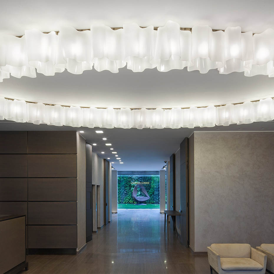 Logico Micro Plafond från Artemide har en skärm i munblåst glas som formar en mjukt vågig och oregelbunden silhuett. De böljande linjerna skapar ett spel mellan ljus och skugga som ger lampan ett levande och organiskt uttryck.