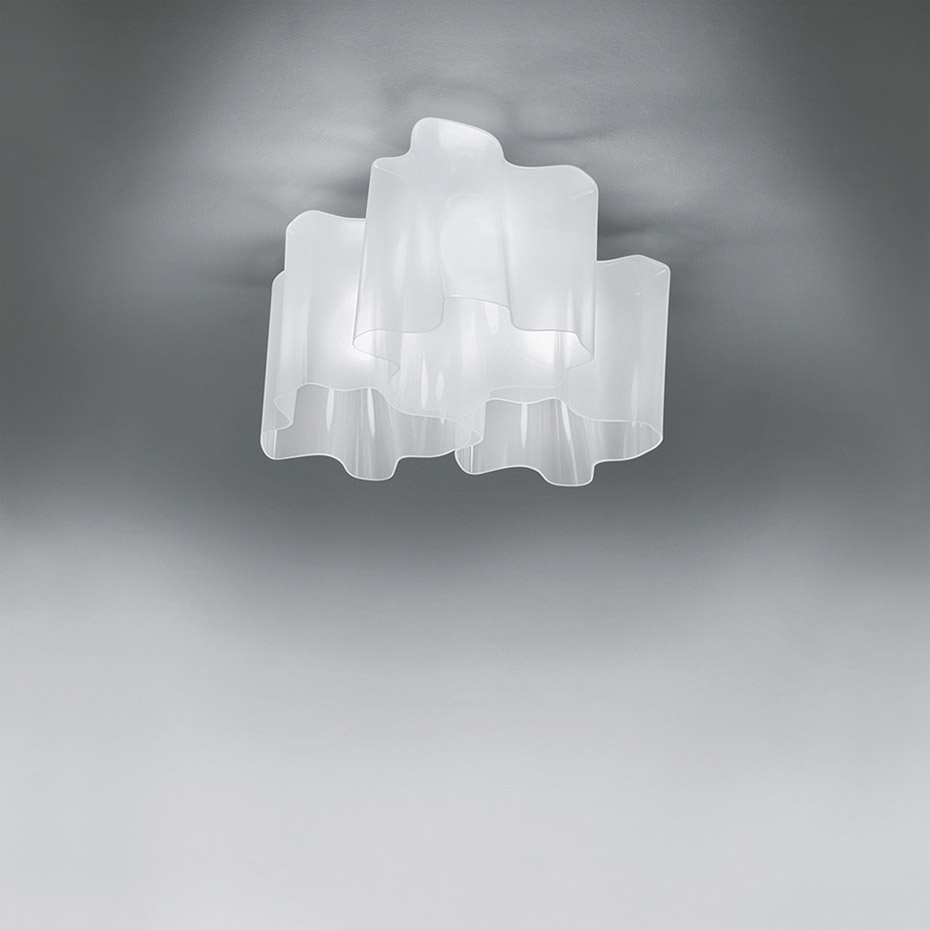 Logico Mini Plafond 3x120° från Artemide har tre skärmar i munblåst glas som formar en mjukt vågig och oregelbunden silhuett. De böljande linjerna skapar ett spel mellan ljus och skugga som ger lampan ett levande och organiskt uttryck.