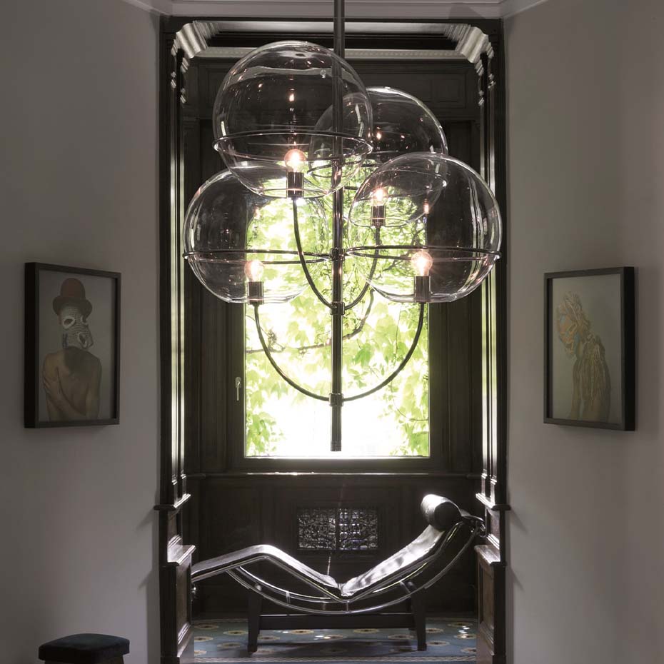 Lyndon 450 pendel från Oluce formgavs av Vico Magistretti år 1977. Den eleganta konstruktionen med flera klara glober skapar ett stämningsfullt och jämnt ljus som passar perfekt över matbordet, i hallen eller i vardagsrummet. En tidlös pendel som kombinerar klassisk form med modern elegans.