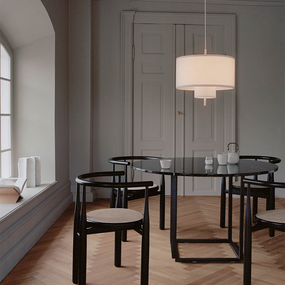 Margin Pendel Ø50cm från New Works är John Astburys moderna tolkning av den klassiska skärmlampan. De överlappande textilskärmarna sprider ett mjukt, varmt ljus och skapar en taktil atmosfär. Den grafiska silhuetten och de välbalanserade proportionerna gör lampan till ett elegant blickfång i rummet.