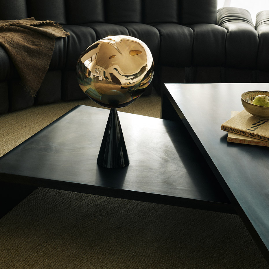 Melt Cone Fat från Tom Dixon är en bordslampa med metalliserad Melt-skärm och stabil konbas. Den glansiga ytan reflekterar omgivningen när den är släckt, och skapar en varm, smält ljuseffekt när den tänds. Passar utmärkt för hyllor, sidobord eller receptionsmiljöer.