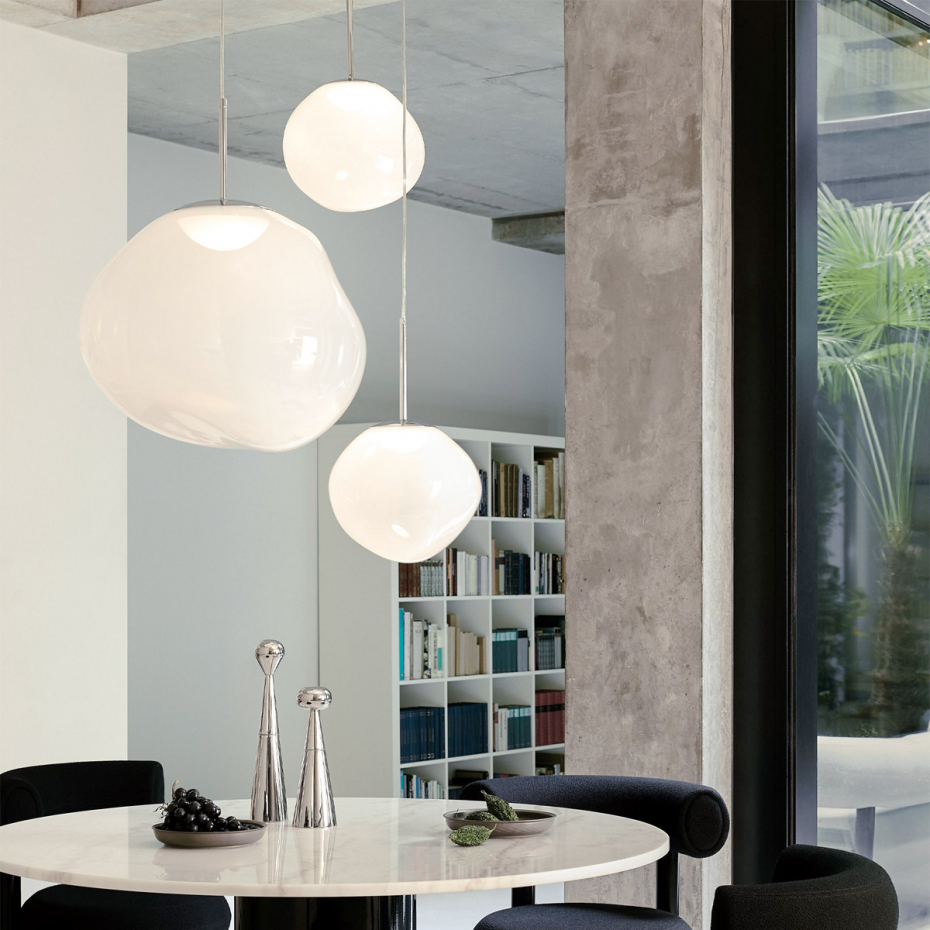 Melt Pendel från Tom Dixon är en ikonisk designlampa med en distinkt, större sfärisk form som vid tändning förvandlas från en spegelblank yta till ett glödande och flytande konstverk. Denna version är försedd med en praktisk E27-sockel, vilket ger dig friheten att själv välja ljuskälla och skapa en personlig karaktär i ditt vardagsrum eller över ett stort matbord.