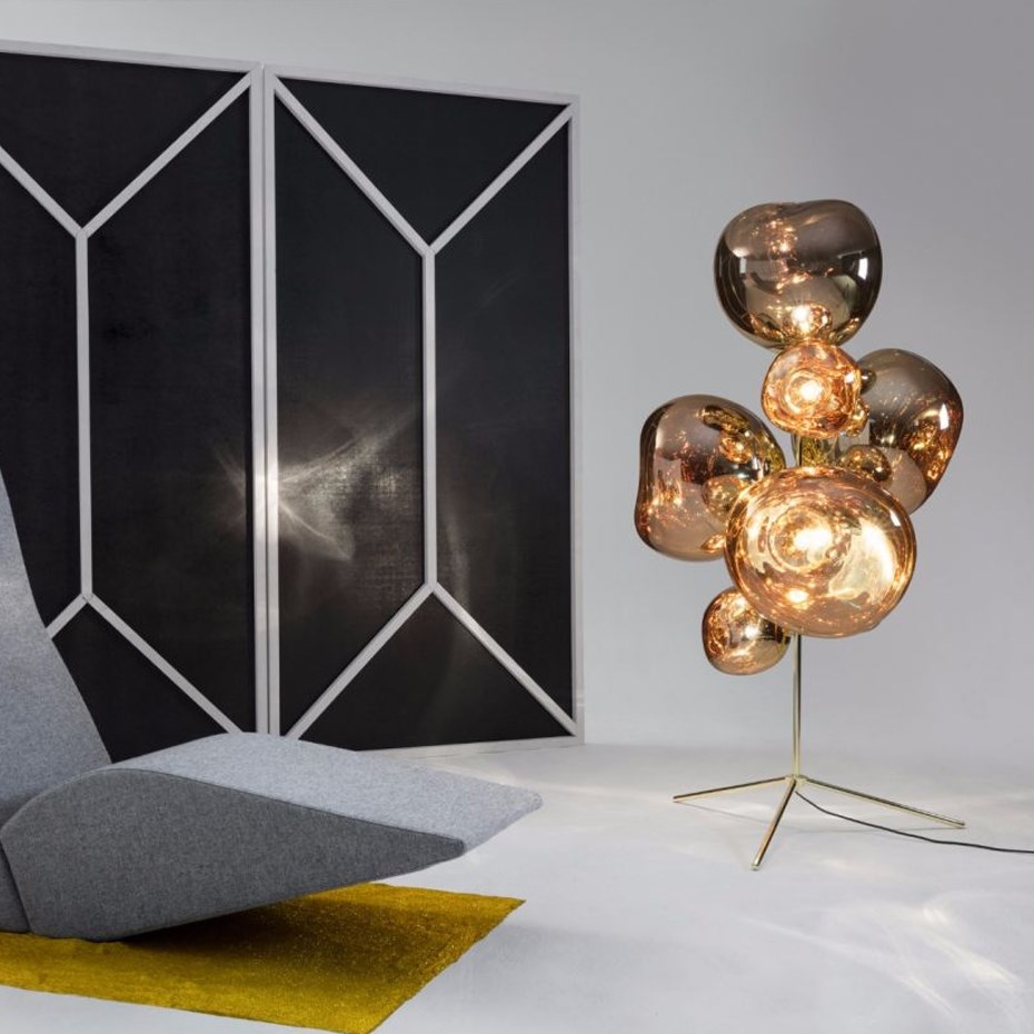 Melt Stand Chandelier från Tom Dixon kombinerar flera Melt-skärmar i en skulptural golvlampa. Den spegelblanka ytan i guld reflekterar ljuset på ett levande sätt och skapar en dramatisk effekt. En stark visuell statement-lampa för större rum, entréer eller offentliga miljöer.