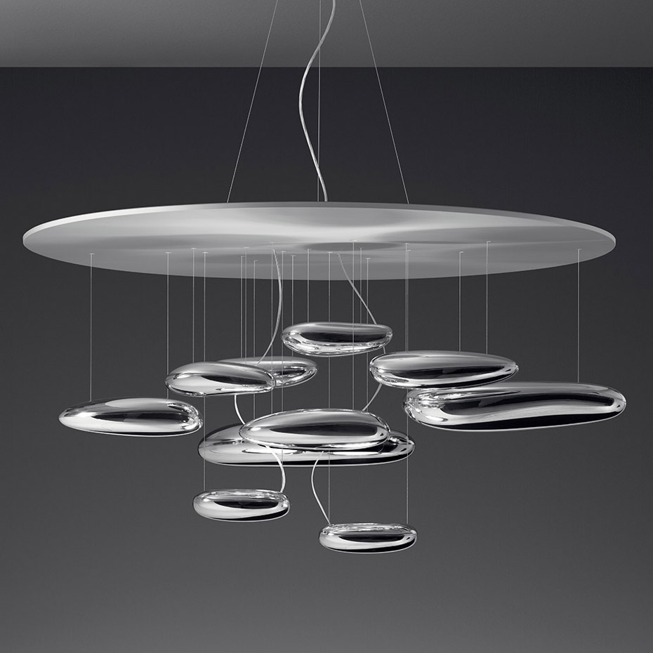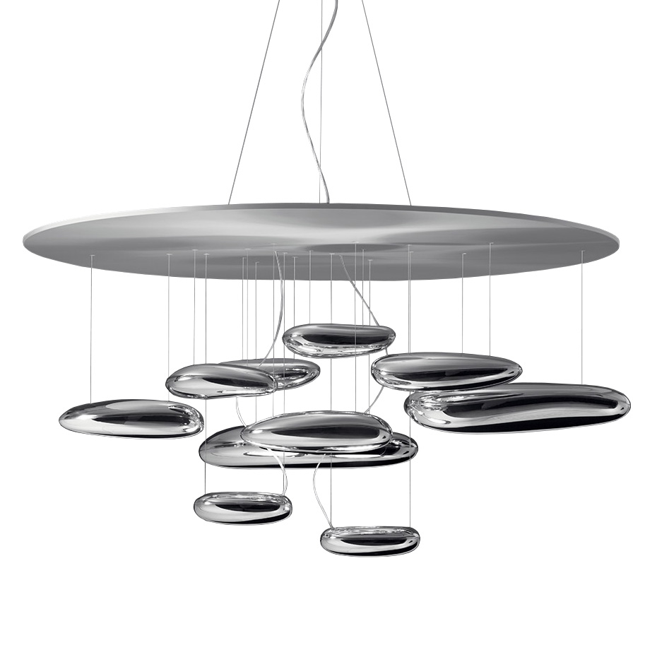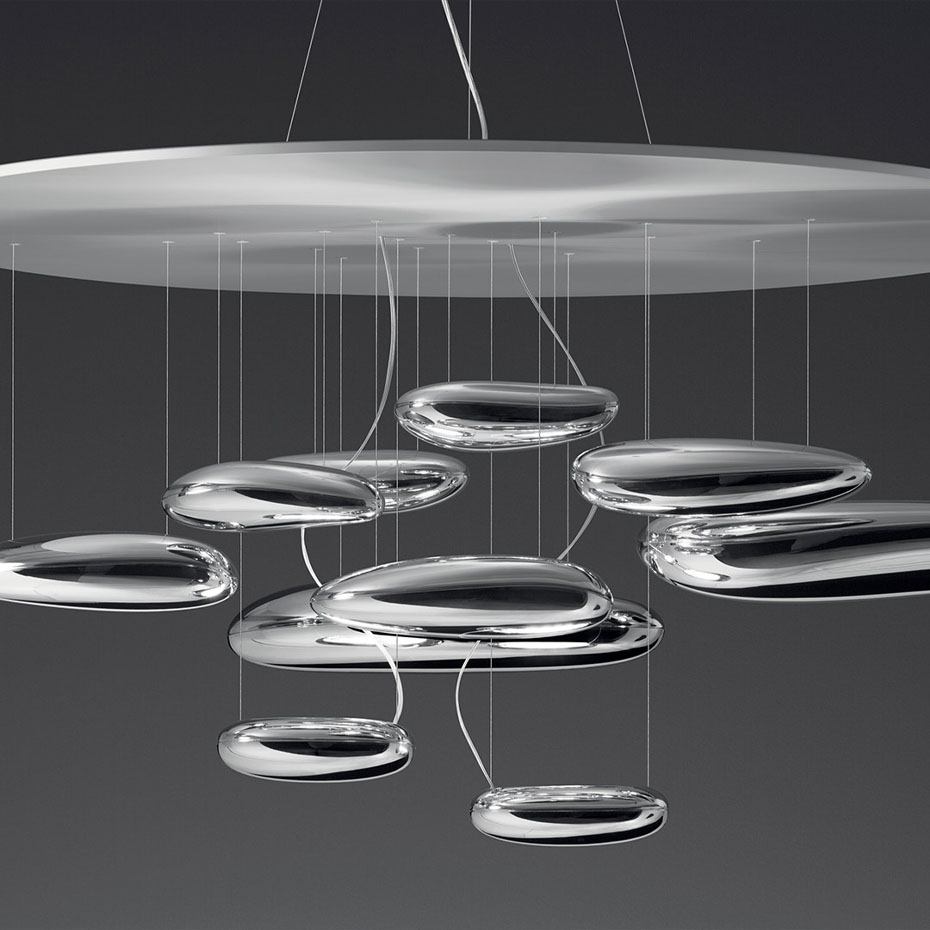 Mercury Pendel från Artemide är en skulptural pendel där stora, kromglänsande former svävar under en aluminiumspegel. Ljuset reflekteras mellan de mjuka, organiska ytorna och skapar ett dynamiskt och levande ljusspel.