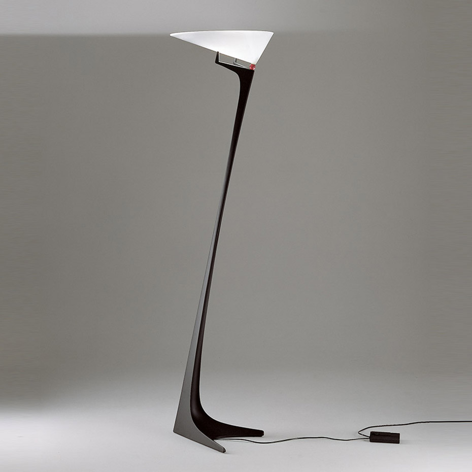 Montjuic Golvlampa från Artemide är en ikonisk golvlampa med en skulptural siluett som utmärks av sina symmetriska triangulära former i bas och skärm, balanserande på en röd sfär.