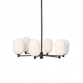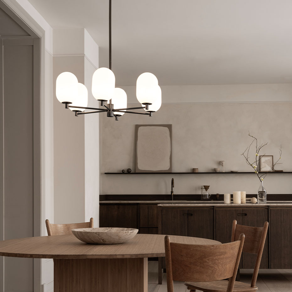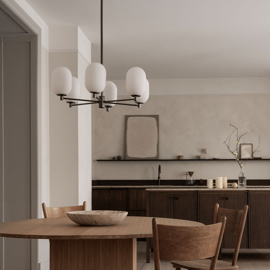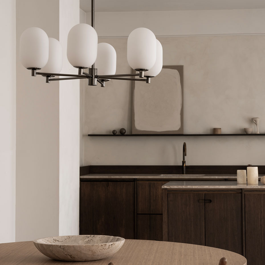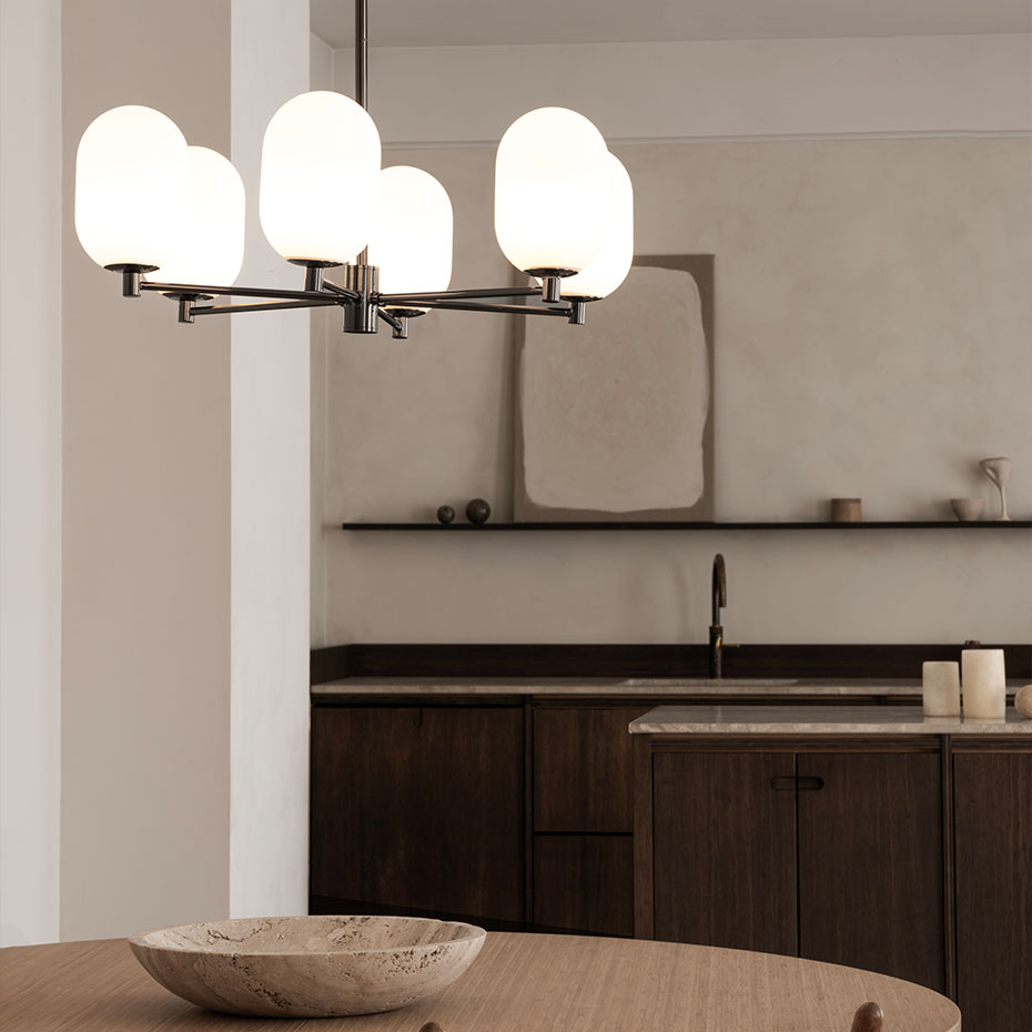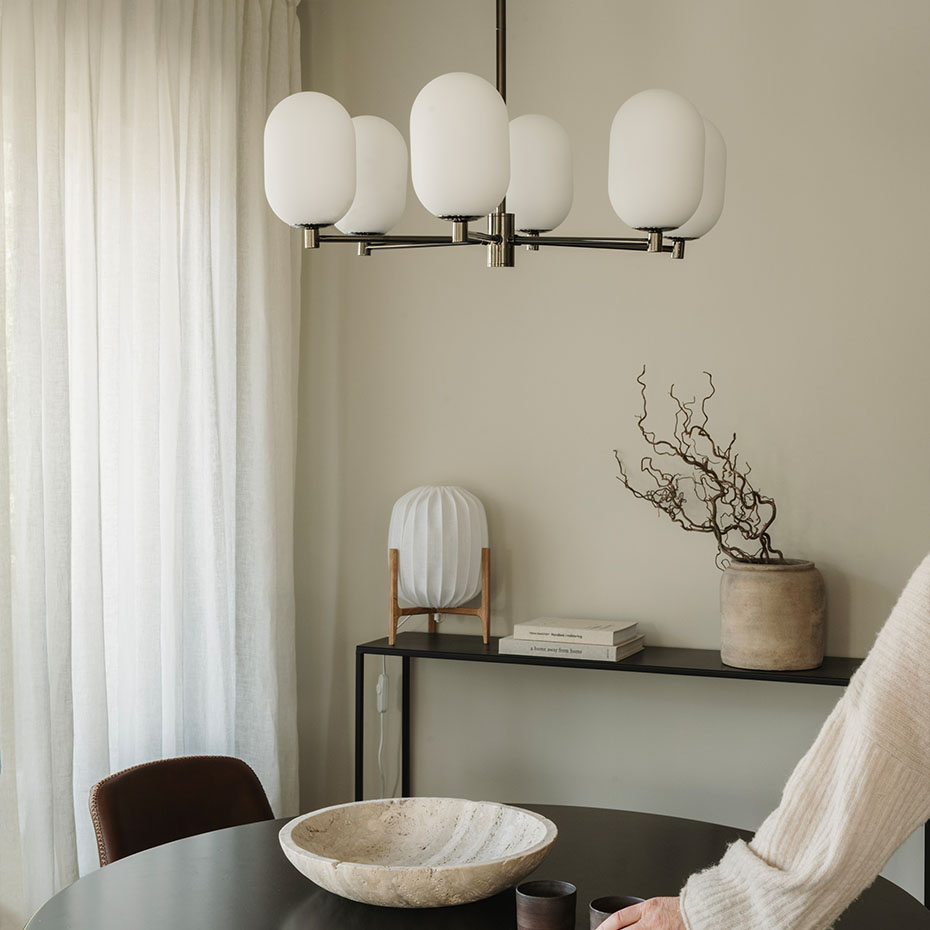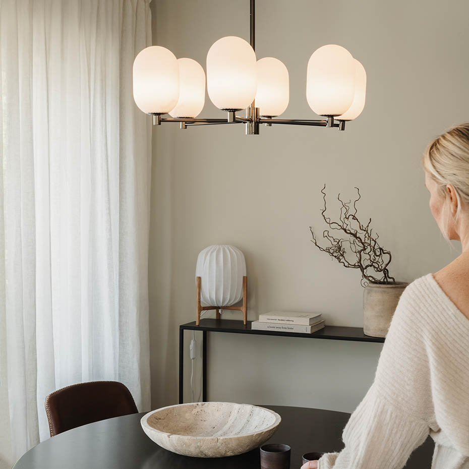 Noor Ljuskrona från Watt & Veke är en elegant takkrona med sex glober i munblåst opalglas och svartkromade detaljer. Ljuskronan sprider ett mjukt, jämnt ljus och skapar en varm och inbjudande atmosfär i vardagsrum, matsal eller entré. Den justerbara stången gör det enkelt att anpassa höjden för både höga och låga tak, och takkåpan för krokupphäng förenklar installationen.