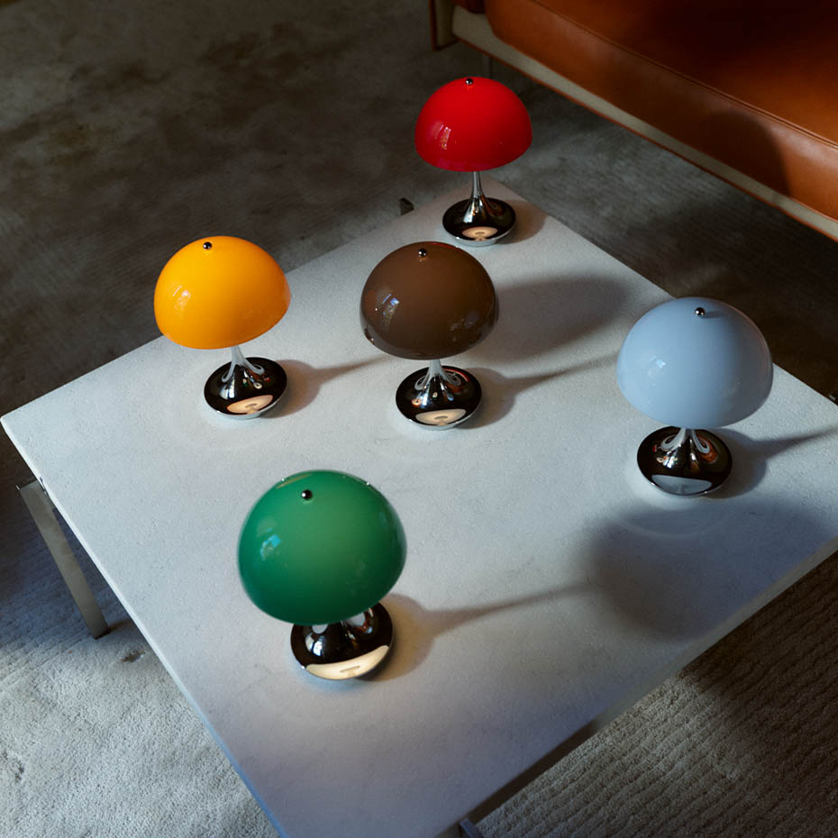• Panthella formgavs av Verner Panton 1971 och är fortfarande en av hans mest populära lampor. De organiska formerna är typiska för hans design. Panthella ger ett mycket behagligt och mjuk ljus, där både foten och skärmen fungerar som en ljusreflektor.